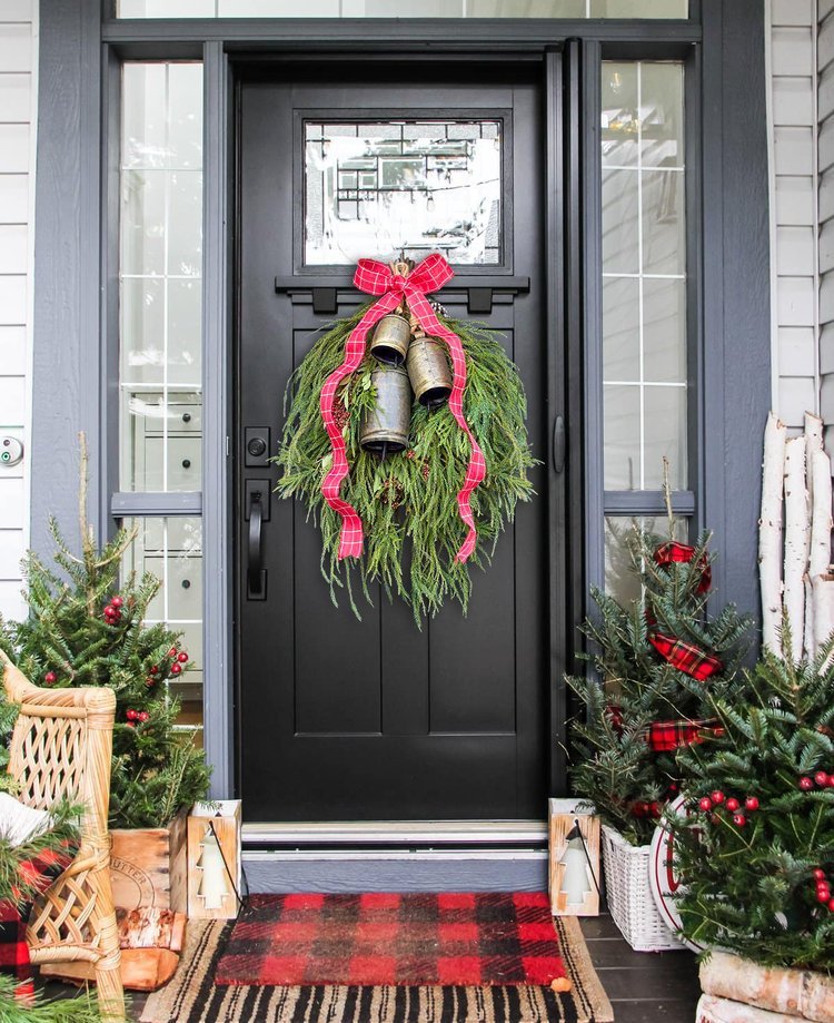 🔔Christmas house tour - a trio of lanterns filled with ornaments, planters filled with greenery, and a greenery swag on the front door are simple porch decorations for Christmas🔔