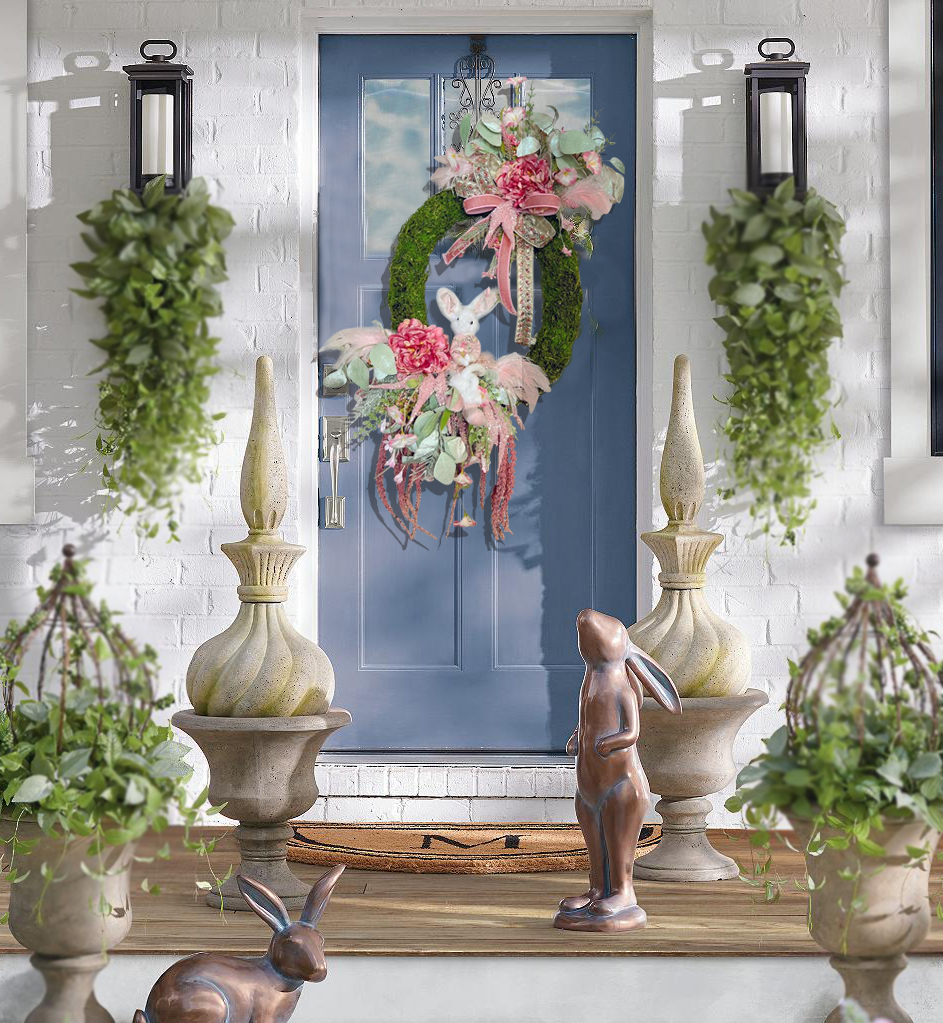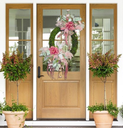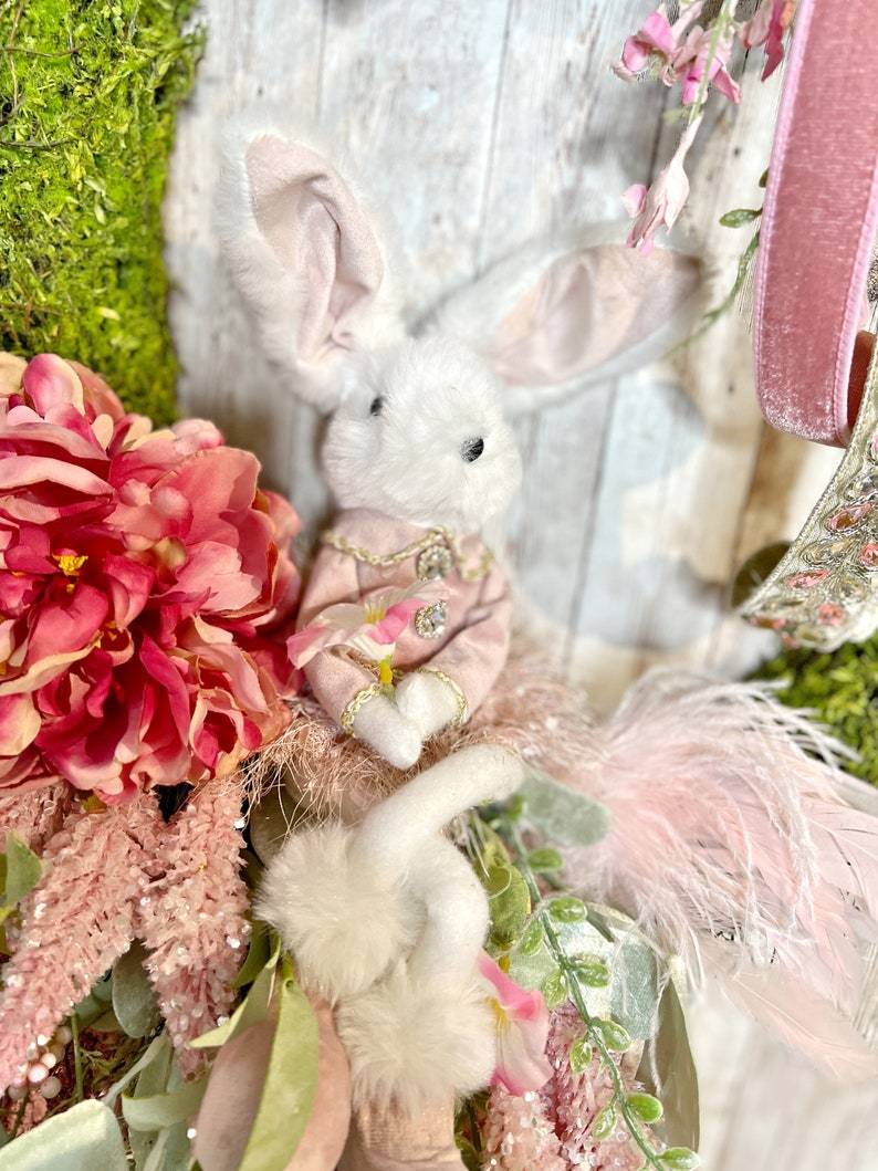 This elegant and gorgeous moss wreath is adorned with dazzling details! From the sweet lavish bunny perched in a nest of flirty florals, to the designer velvet and jeweled ribbons and curls.