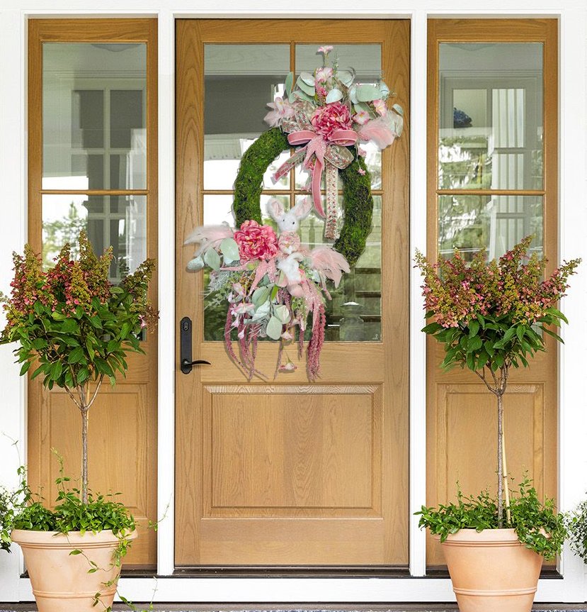 Three-section design, the top and bottom are gorgeous flower clusters and rabbit decoration, a circle of green moss in the middle, you can also add your favorite decoration in the middle of the green moss, so that this wreath has infinite possibilities of reverie.
