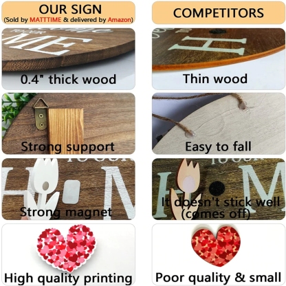 The interchangeable season sign is make of wood, thick and durable, green leaves is artificial, very realistic, nice deep color of the wood and design perfect for each season.