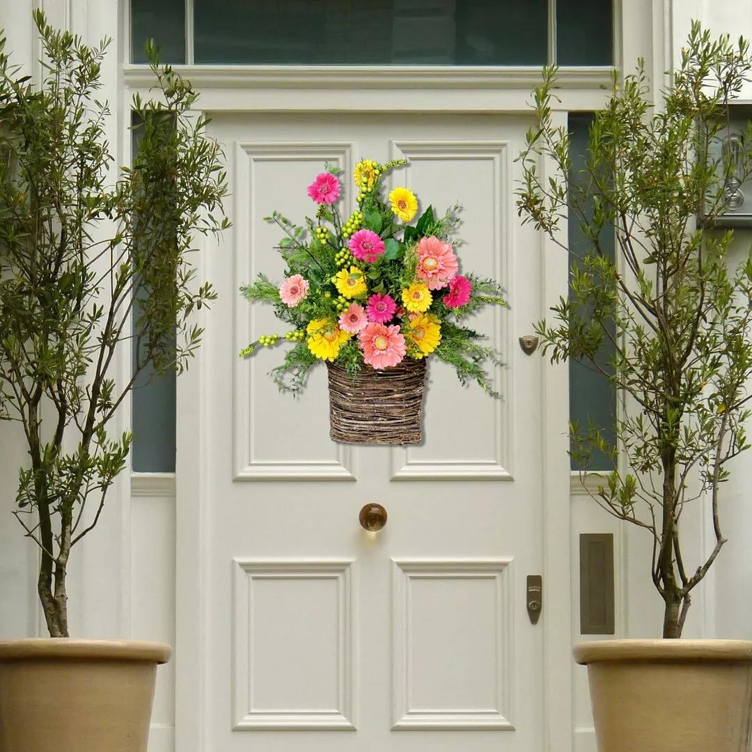 Gerbera daisy door basket decoration on the front door. This gerbera daisy door basket is very hospitable. You will fall in love with it at the front door! Your friends will be surprised by your decoration! Because they have never seen such a wreath! This will open a new chapter in your circle of friends, you will lead a new trend!