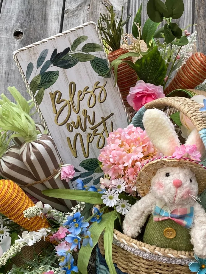 🐰 Easter basket filled with moss, floral, and a large Easter egg, and of course a cute mini bunny