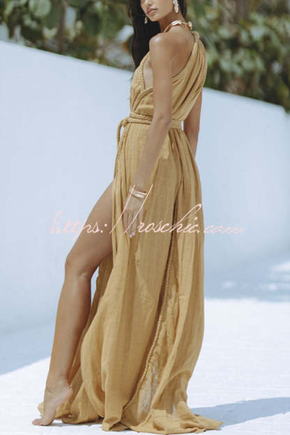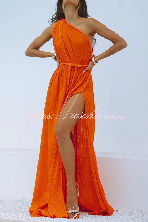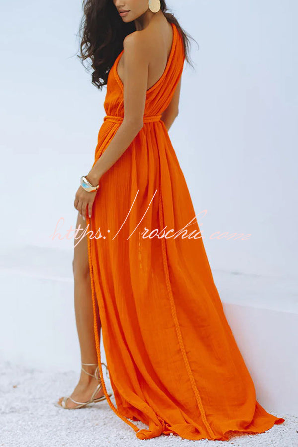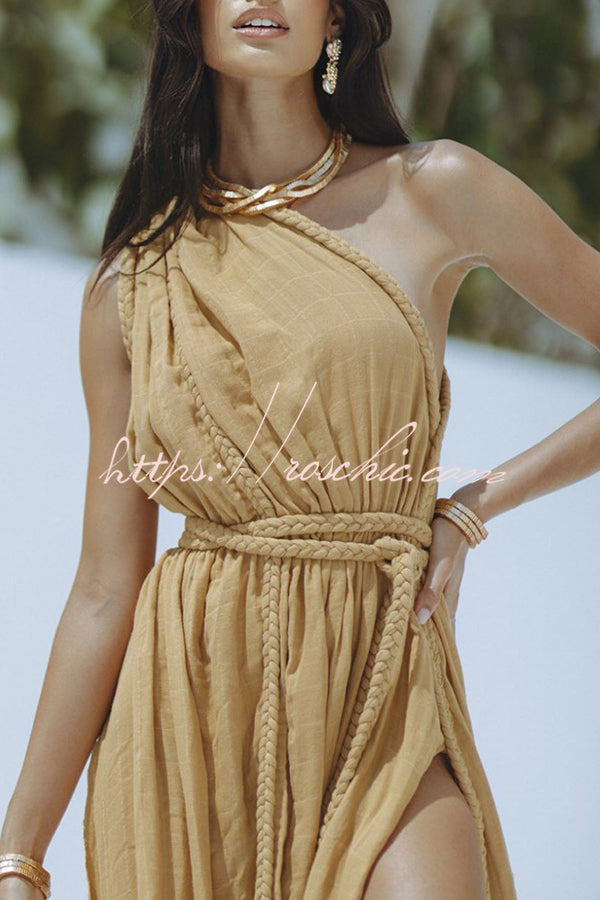Avani Linen Blend Draped Braids One Shoulder Slit Cover Up Maxi Dress