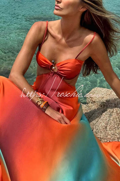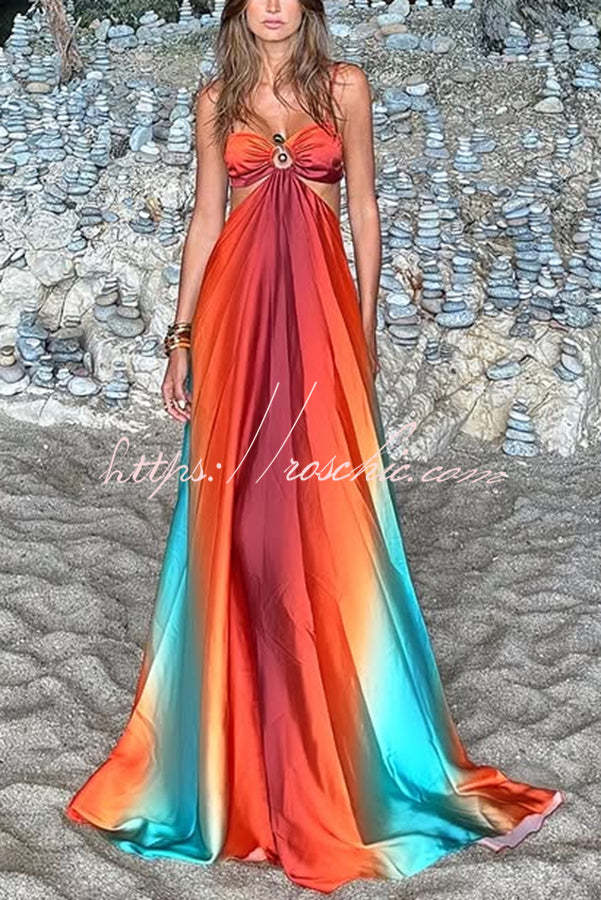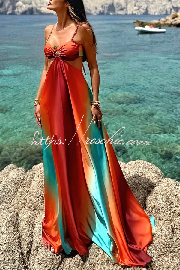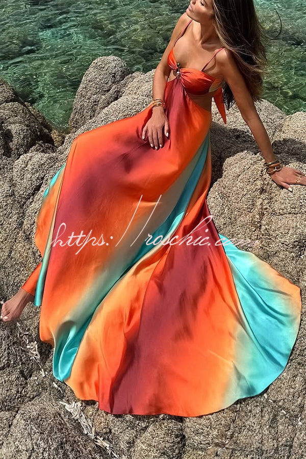 Neon Sunset Printed Metal Decoration Cutout Back Tie-up Vacation Maxi Dress