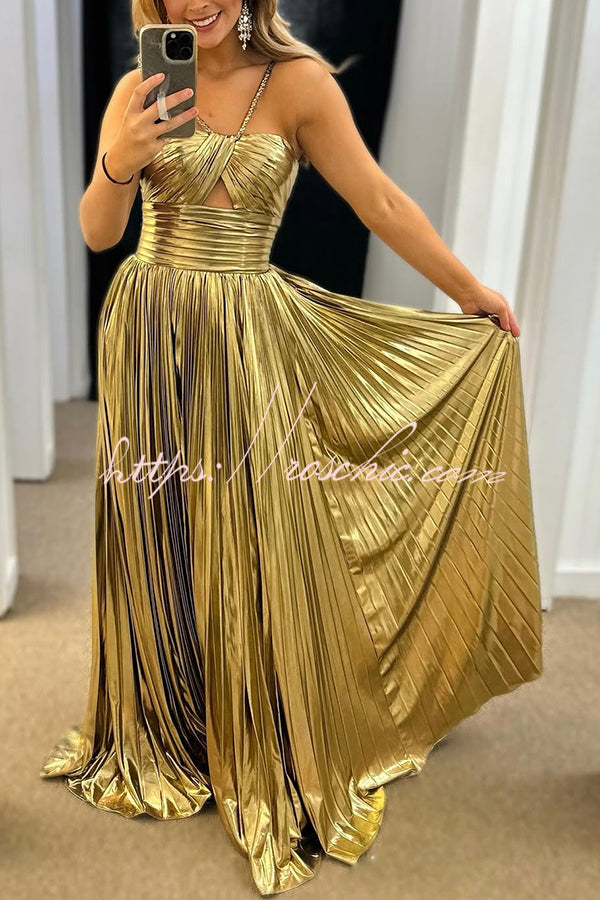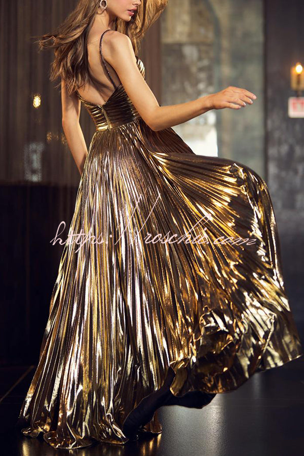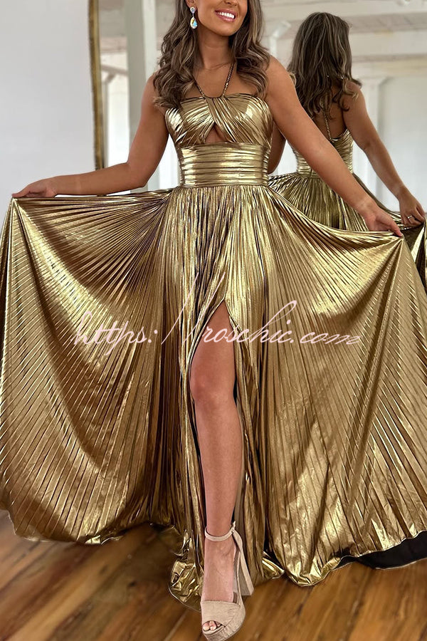Queen Style Metallic Fabric Cross Neck Cutout Slit Pleated Maxi Dress