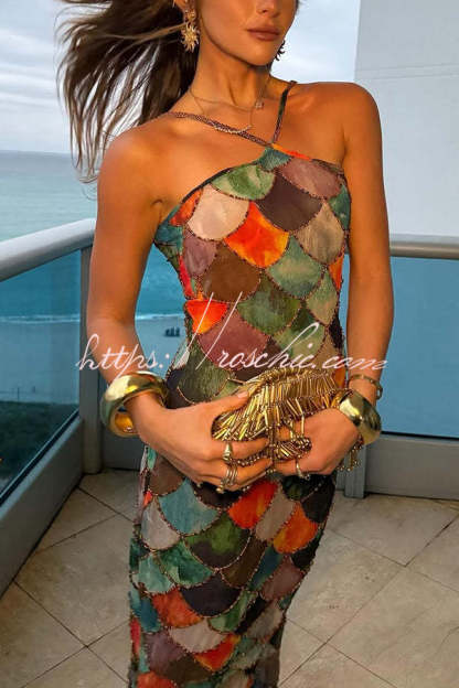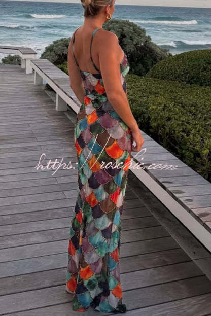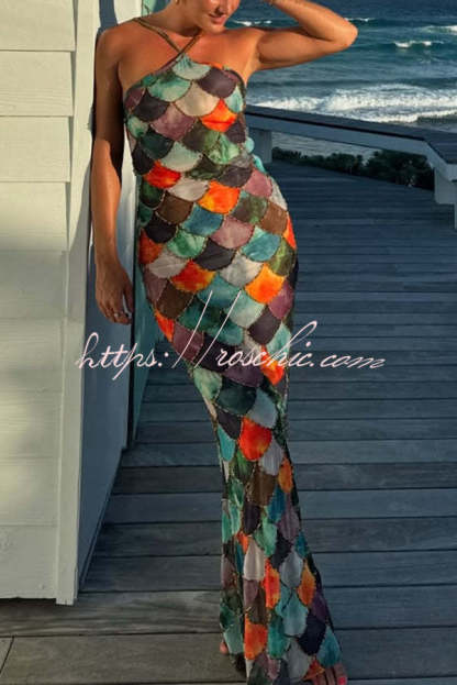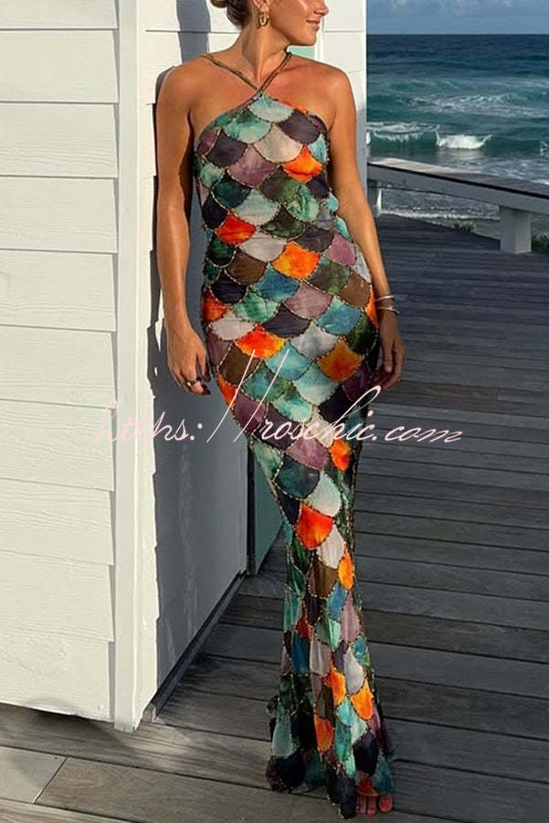 Little Mermaid Colorful Scales Print Halter Maxi Dress