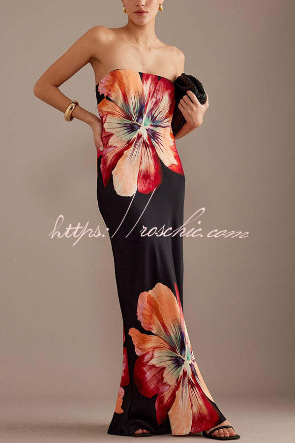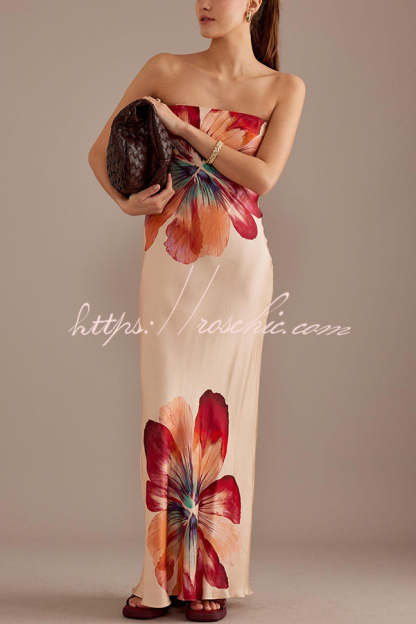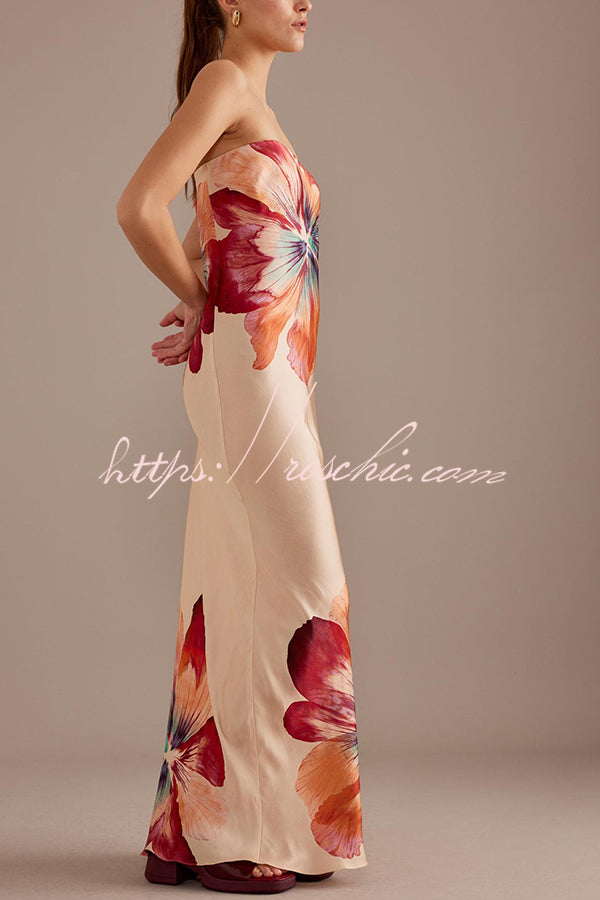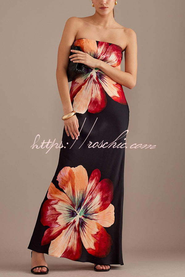 Charming Lady Satin Floral Print Bandeau Loose Maxi Dress