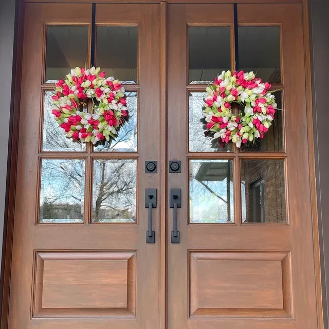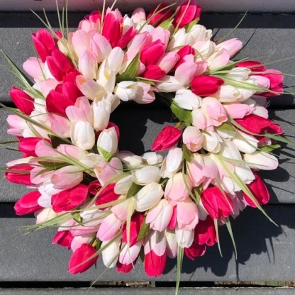 My EXCLUSIVE and LIMITED tulip wreath shown in the first picture contains hundreds of beautiful pink and white silk tulips. This large wreath is perfect for your front door or indoor space. The wreath sizes available range from 13 inches round and 3 inches deep. The silk flowers were carefully arranged onto a beautiful grapevine wreath backing. A beautiful wreath that will last years.