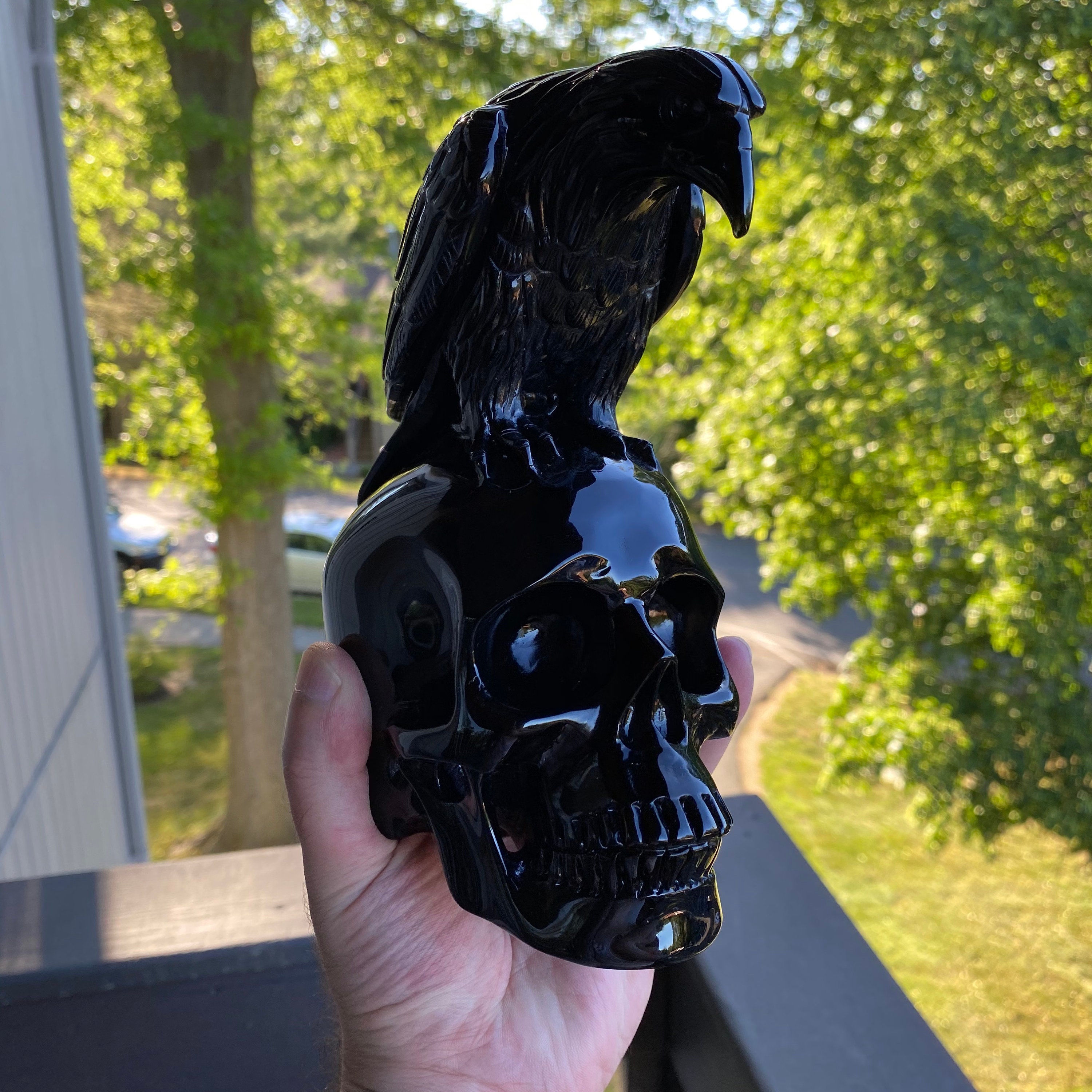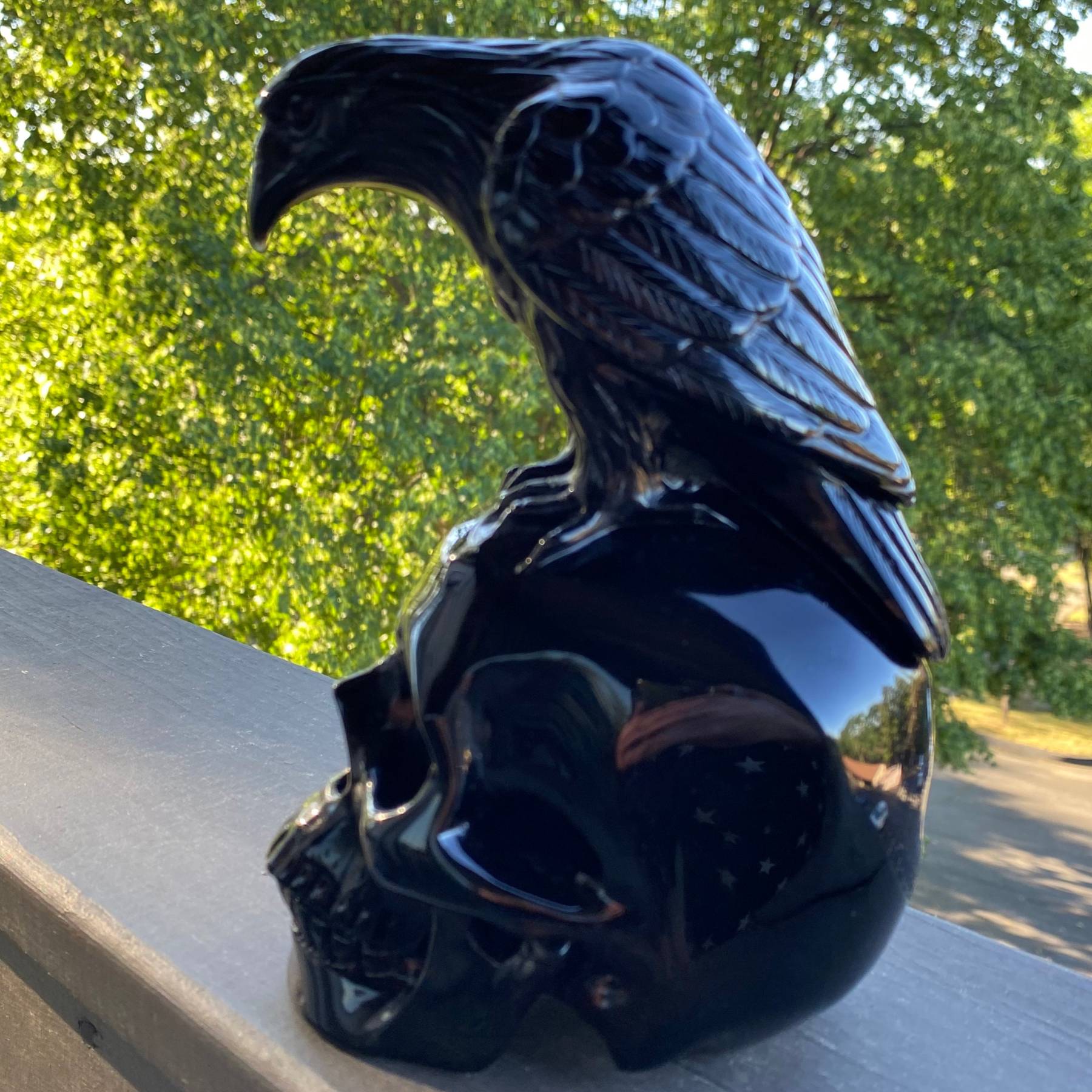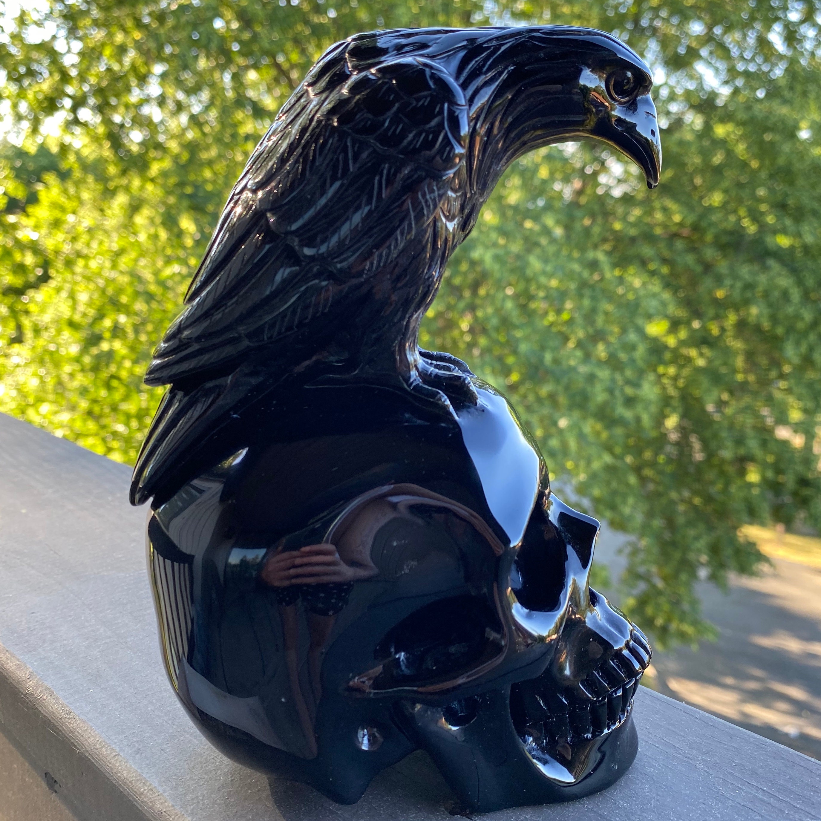 This Absolutely Stunning Skull and Raven is hand carved and polished.Black Obsidian is a very powerful and creative stone.  It increases self-control.  It forces facing up to one’s true self.  Releases imbalances and negative energies.  Black Obsidian is protective and provides support during change.  It repels negativity and disperses unloving thoughts.