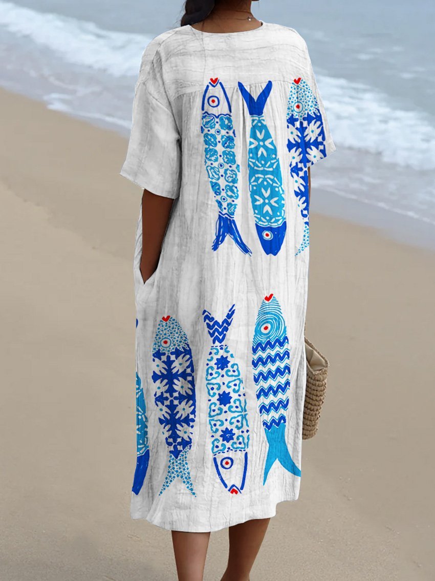 Blue Floral Fish-shaped Decorative Pattern Flowy Dress