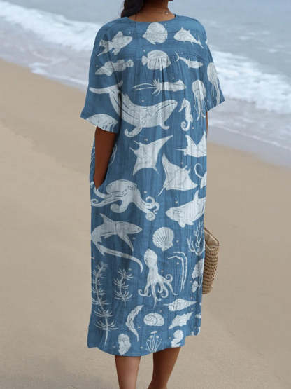Blue Sea Creatures Decorative Pattern Flowy Dress