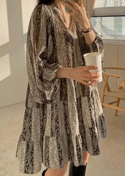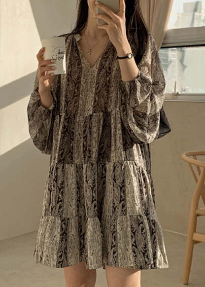 Bohemian Photo Color Print Patchwork Mid Dress Lantern Lantern