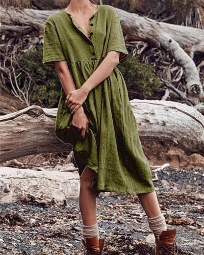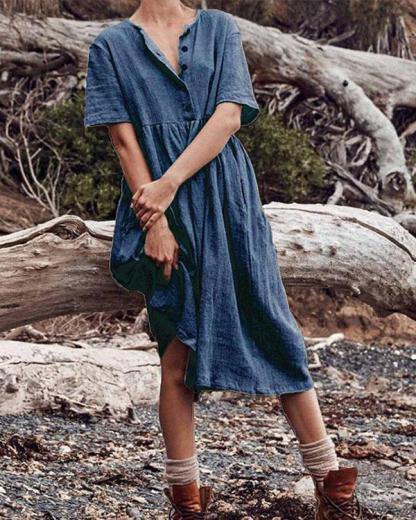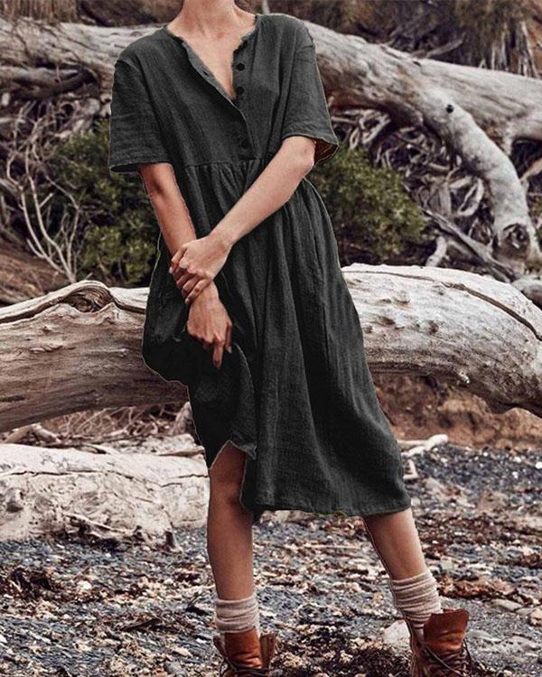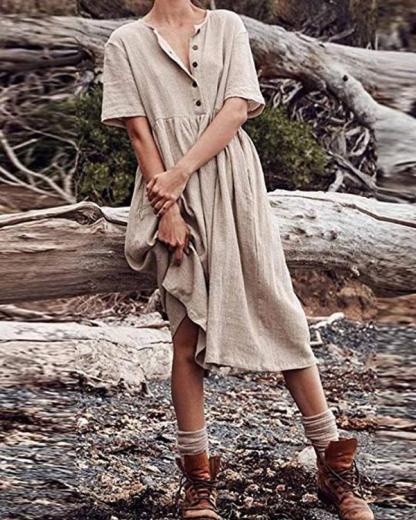 Boho Cotton Linen Dress Women Solid Short Sleeve Button Dress