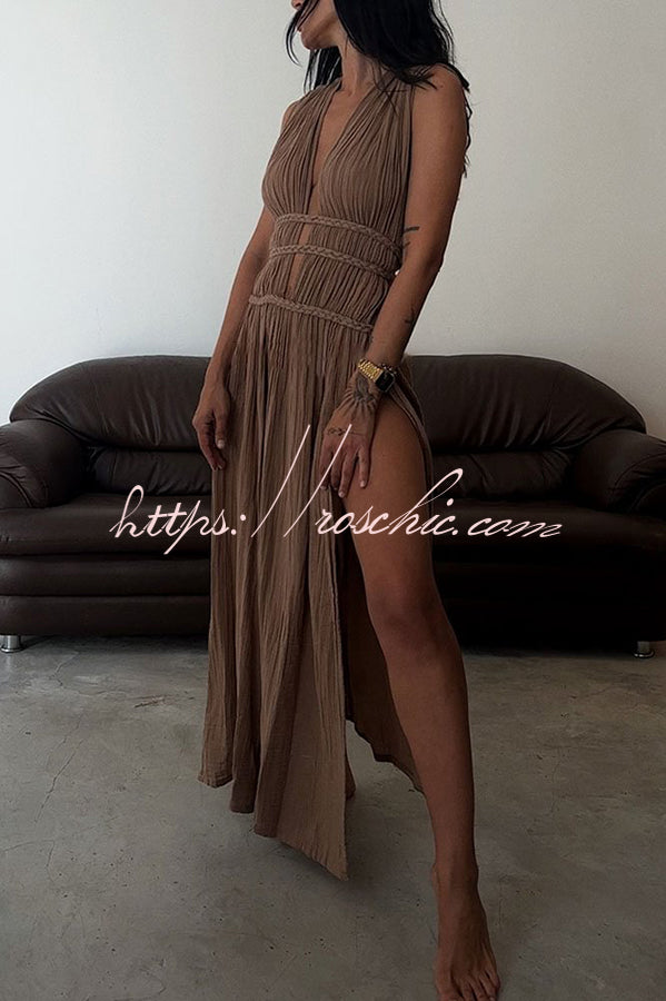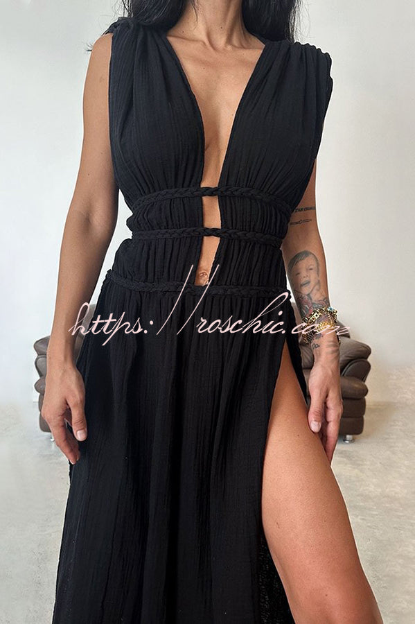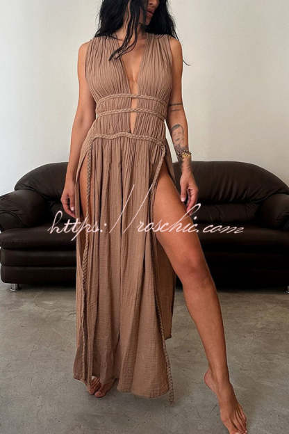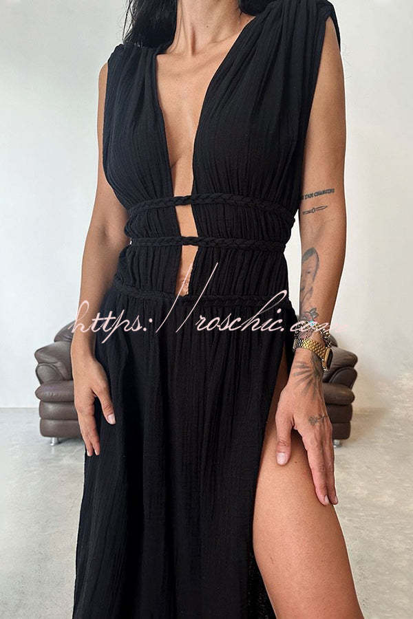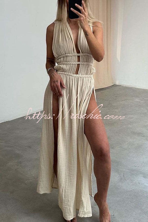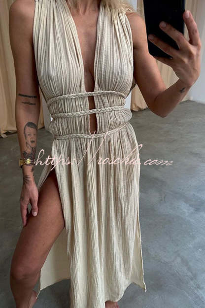 Boho with Elegance Linen Blend Braids Belt Cutout Slit Kaftan Maxi Dress
