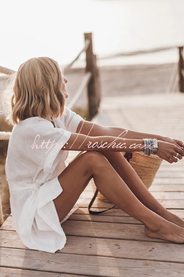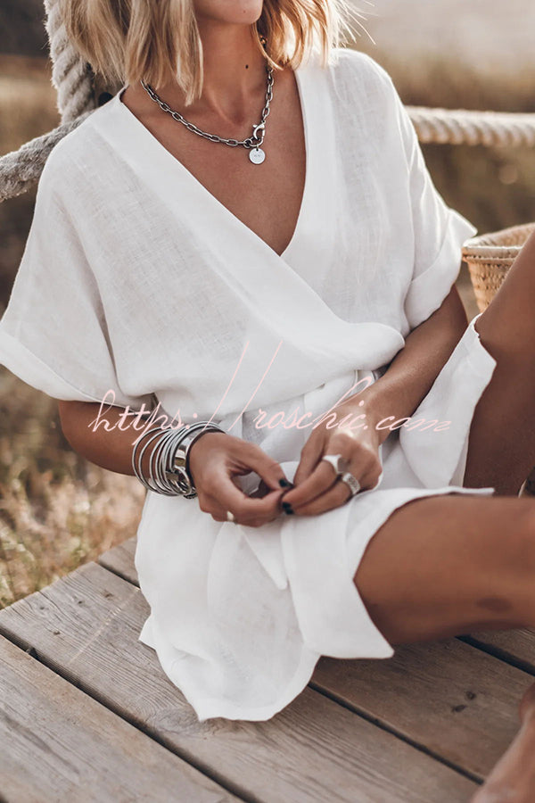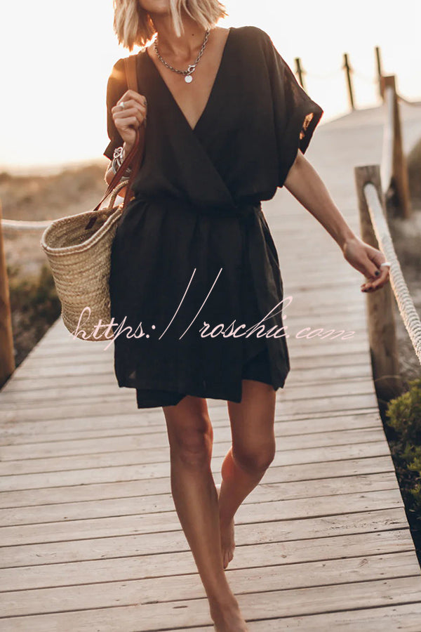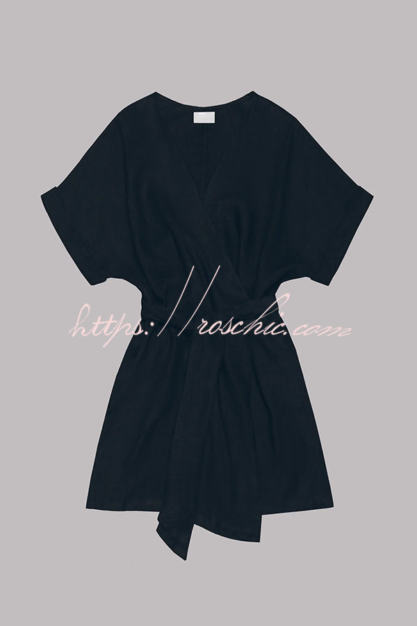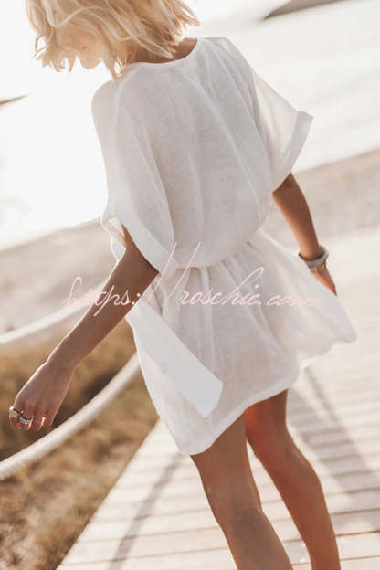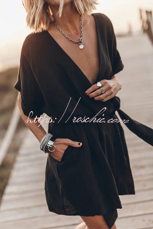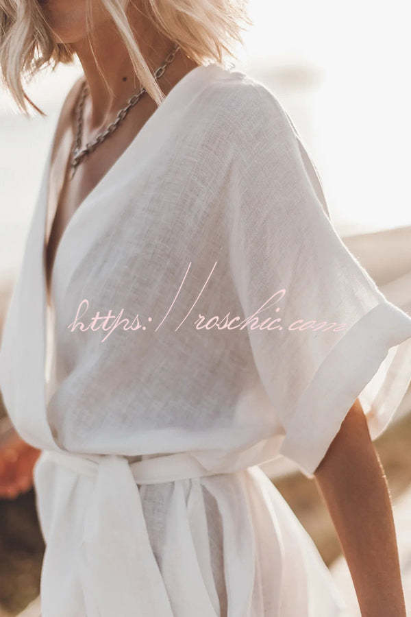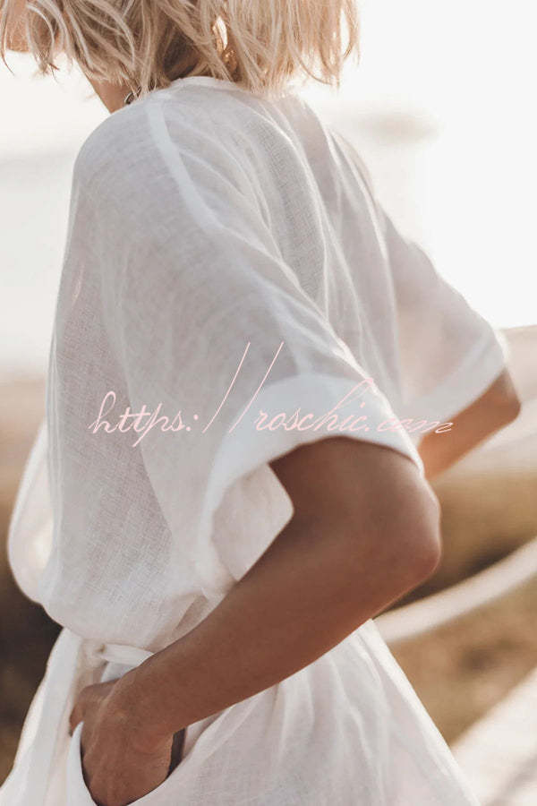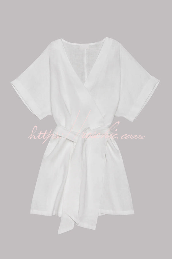 Breezy Retreat Cotton Linen Blend Pocketed Belt Kimono Mini Dress