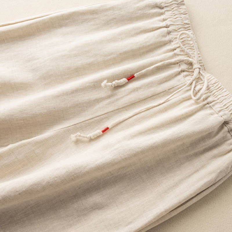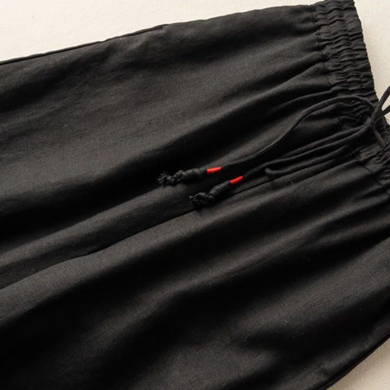 Buddha Stones Casual Embroidery Bohemian Pattern Drawstring Cotton Linen Women's Wide Leg Pants With Pockets