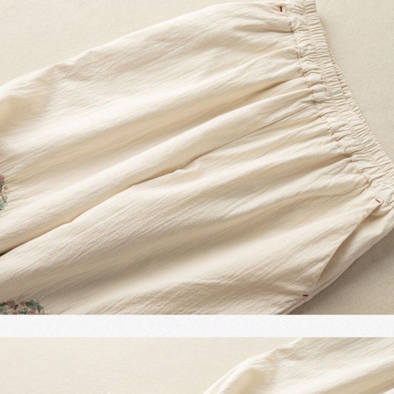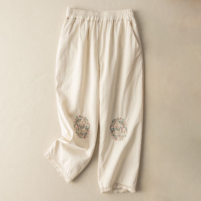 Buddha Stones Casual Lace Trim Embroidered Cotton Harem Pants With Pockets