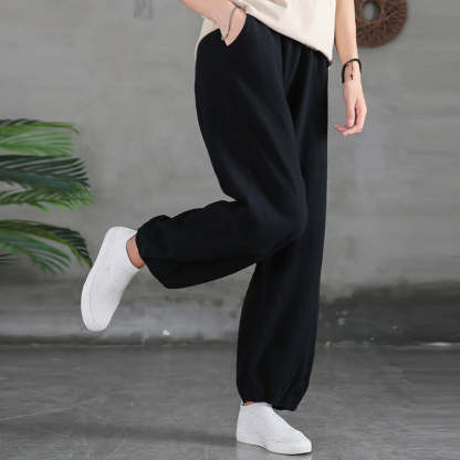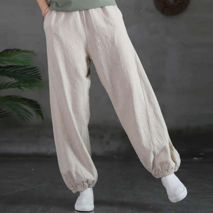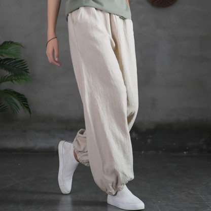 Plain Color Ramie pants feature a comfortable blend of ramie, linen, and cotton, providing a breathable and soft feel. These pants are designed with a gathered elastic cuff at the ankles, offering a secure fit and a refined look. Equipped with pockets for practicality, these pants are ideal for those seeking a versatile piece with a functional and comfortable design.💕