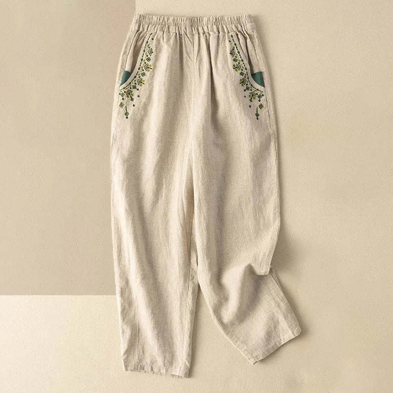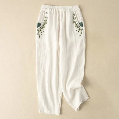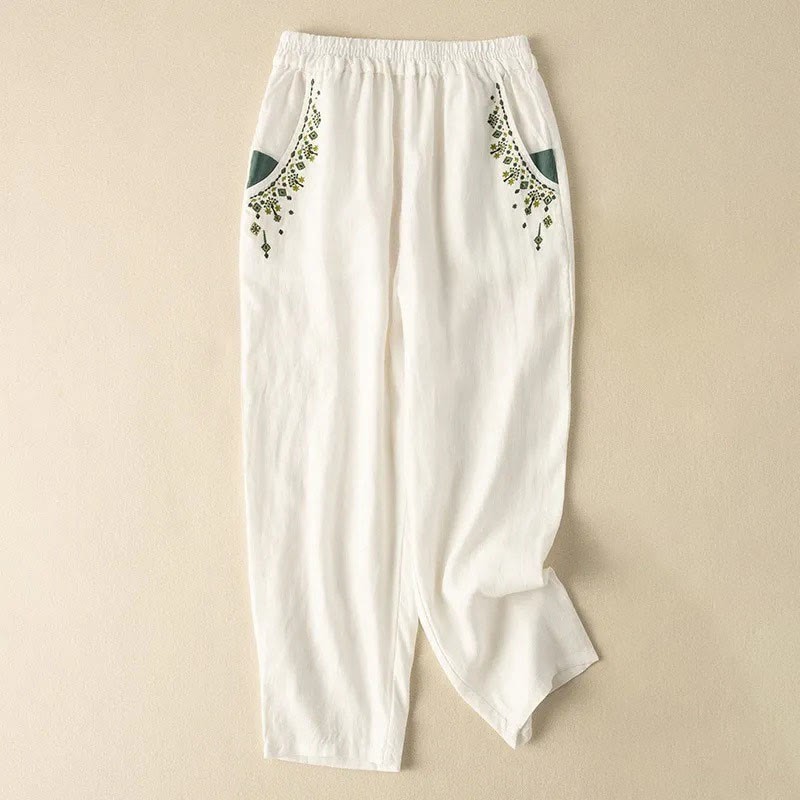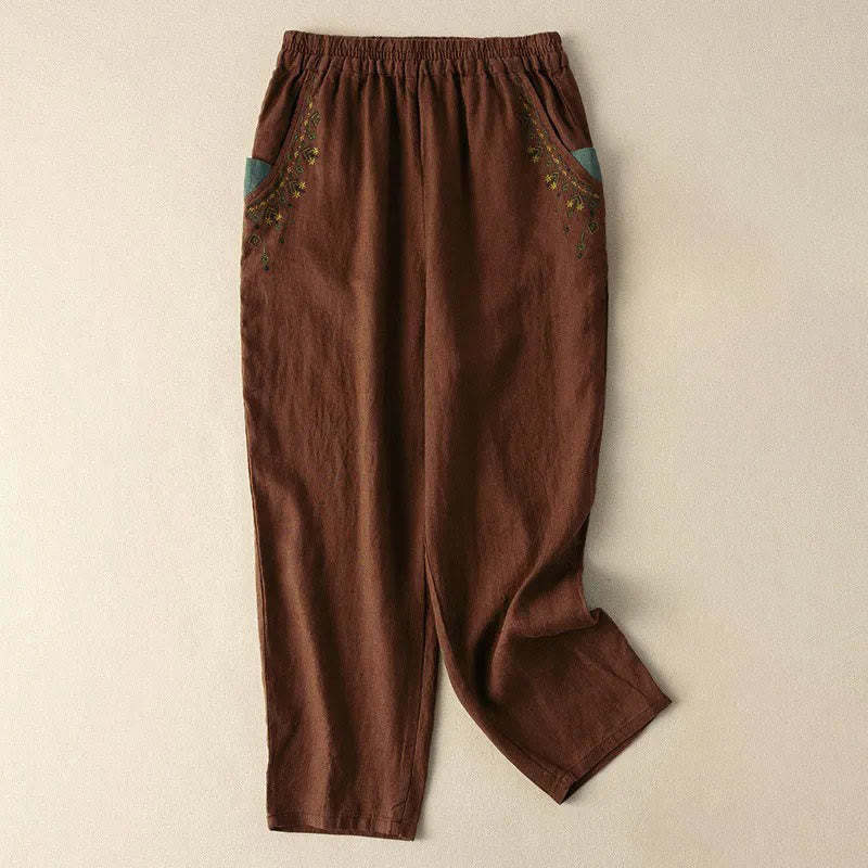 Buddha Stones Vintage Embroidery Elastic Waist Harem Pants With Pockets