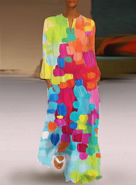 Casual Colorful Abstract Art Print V-neck Long-sleeved Dress