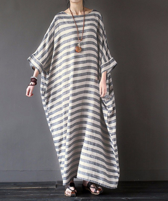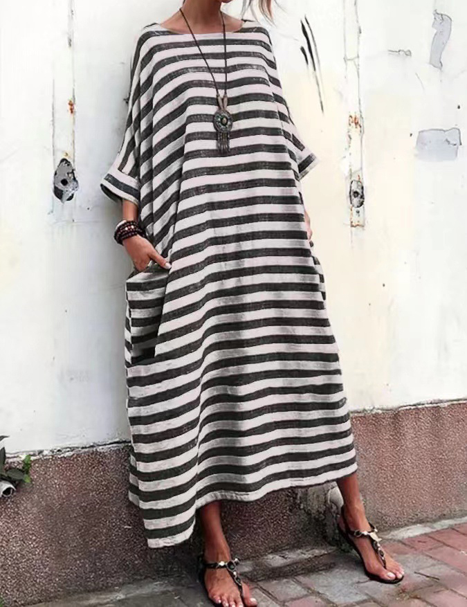 Casual Cotton Linen Stripe Loose Plus Size Long Dress