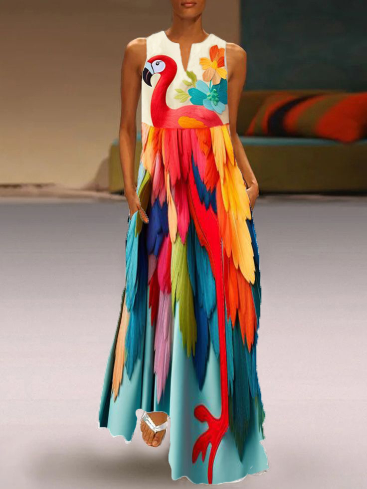 Casual Cute Flamingo Print V-Neck Sleeveless Dress