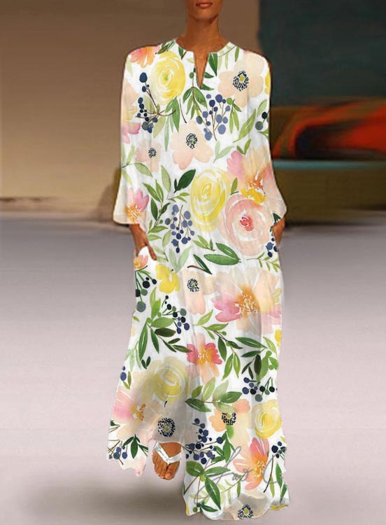 Casual Floral V Neck Long Sleeve Dress