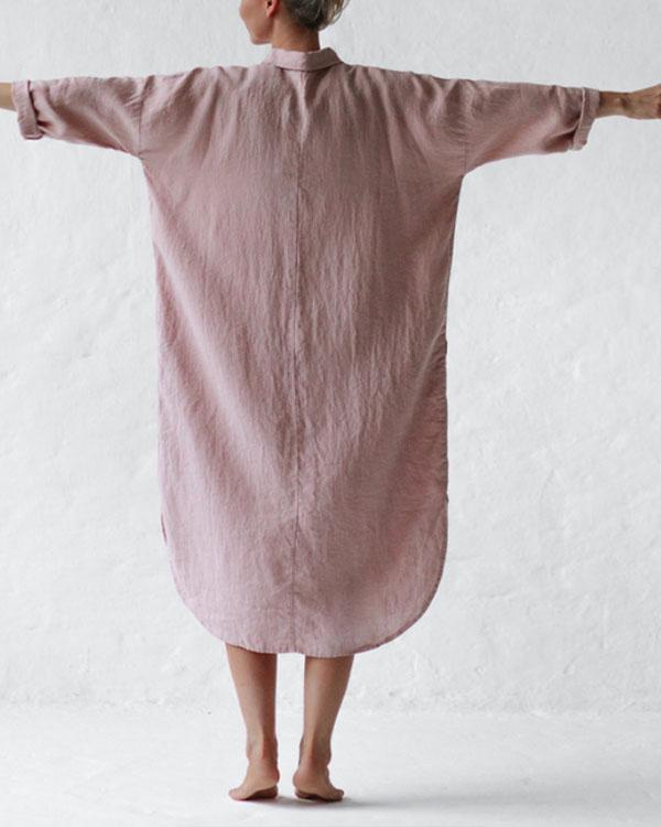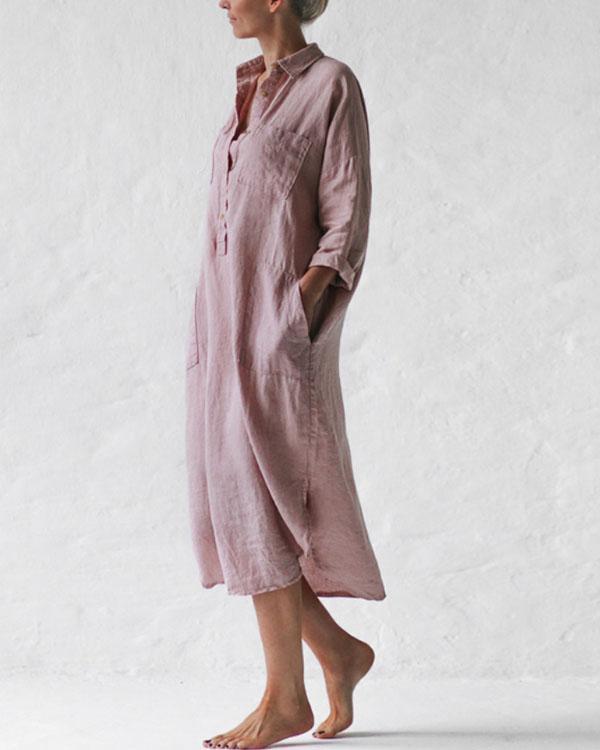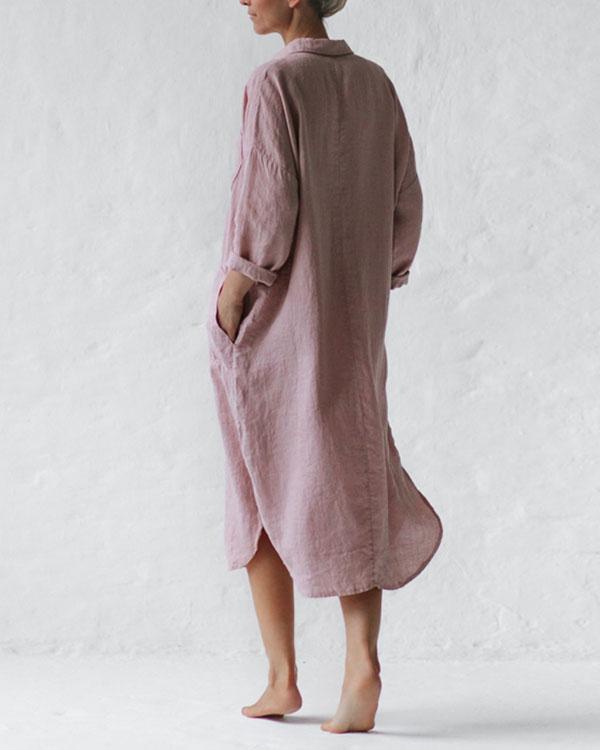 Casual Pink Solid Linen Pullover Shirt Dresses with Pockets
