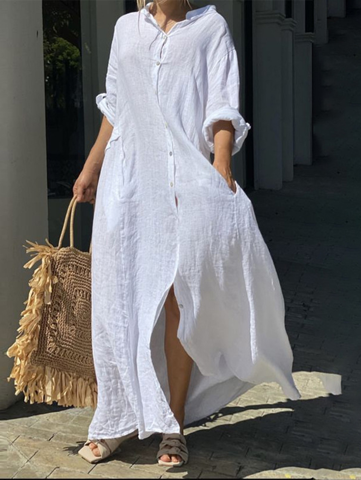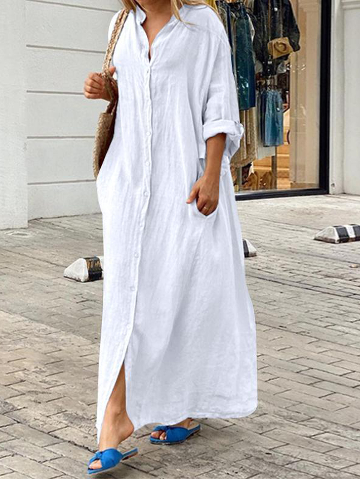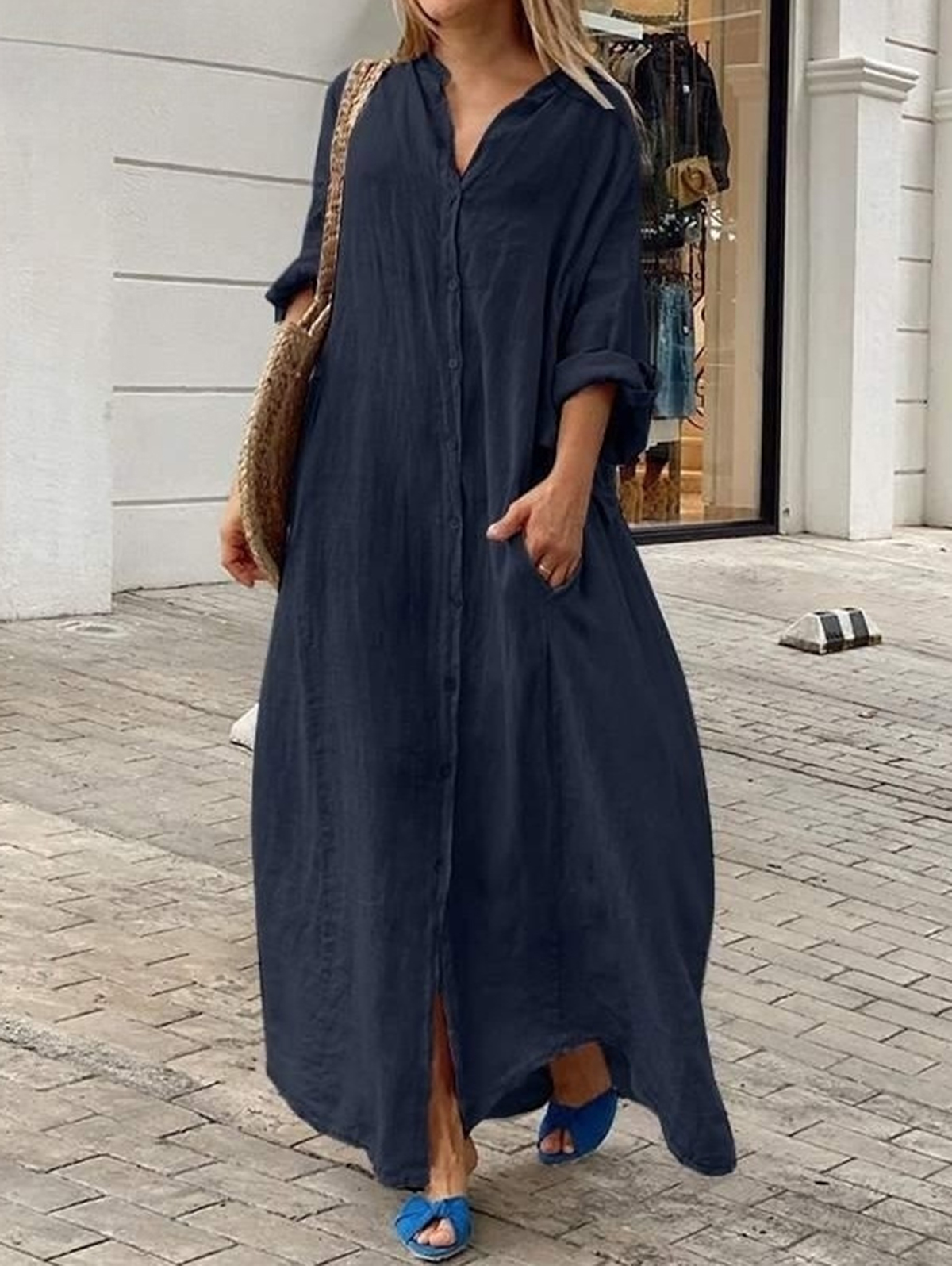 Casual Plain Single Breasted Pocket Long Sleeve Loose Maxi Dress