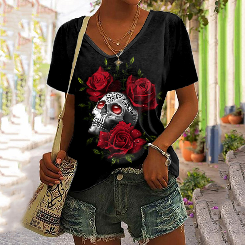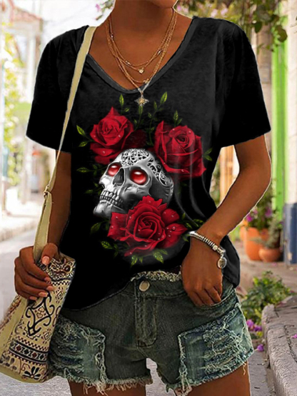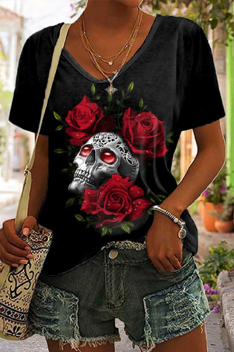 Casual Rose Skull Print T-Shirt