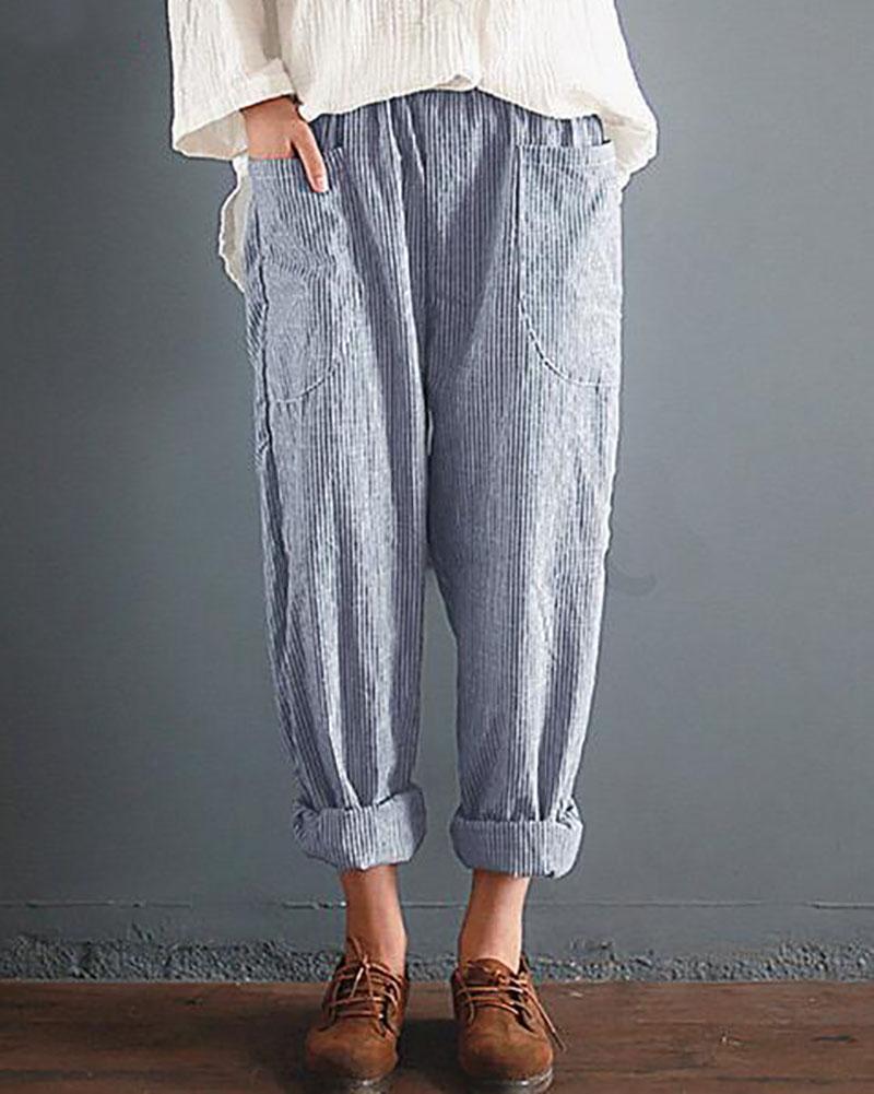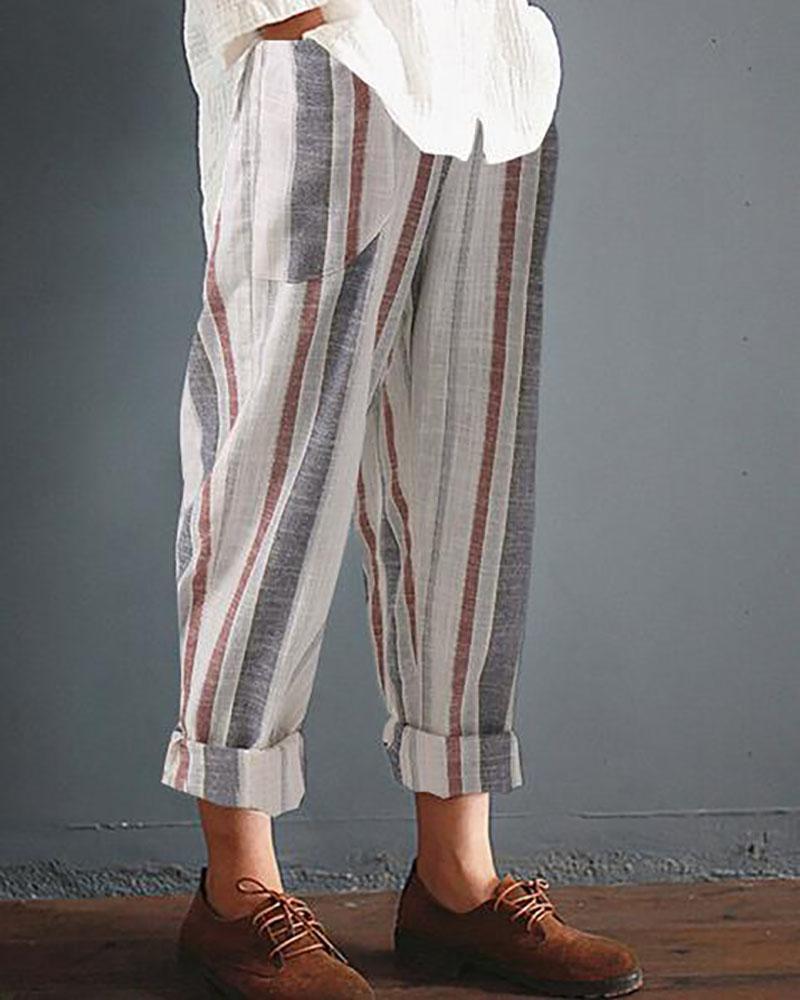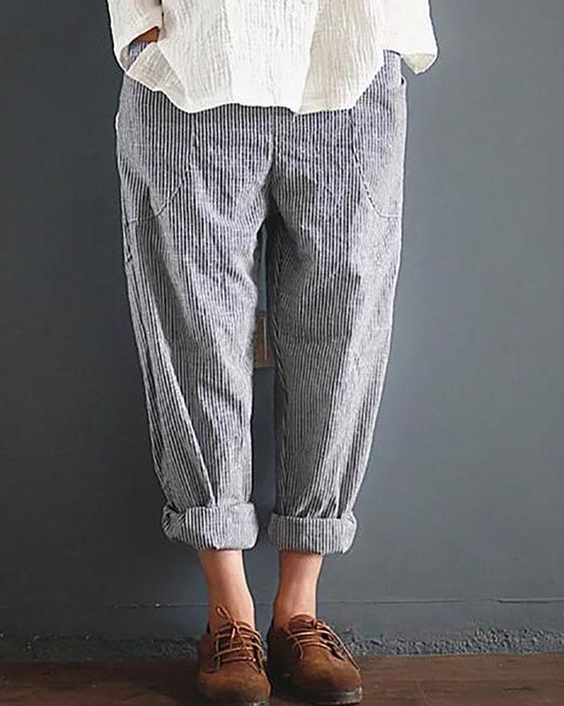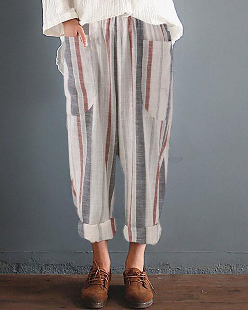 Casual Striped Pockets Cotton Linen Pants