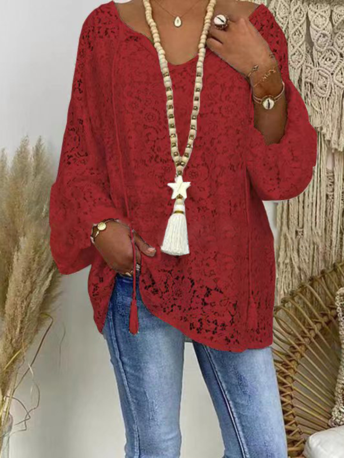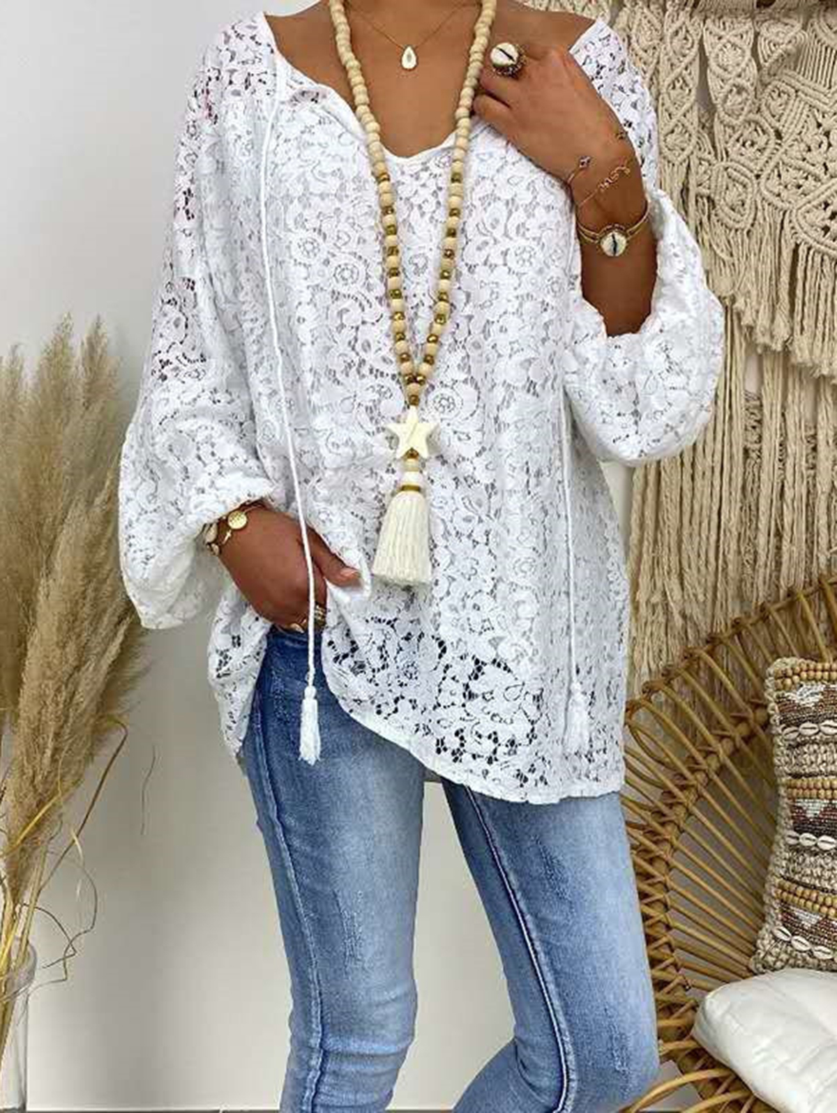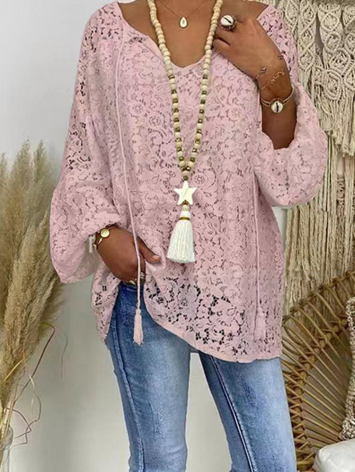 Casual V Neck Loose Lace Hollowed Drawstring Blouse