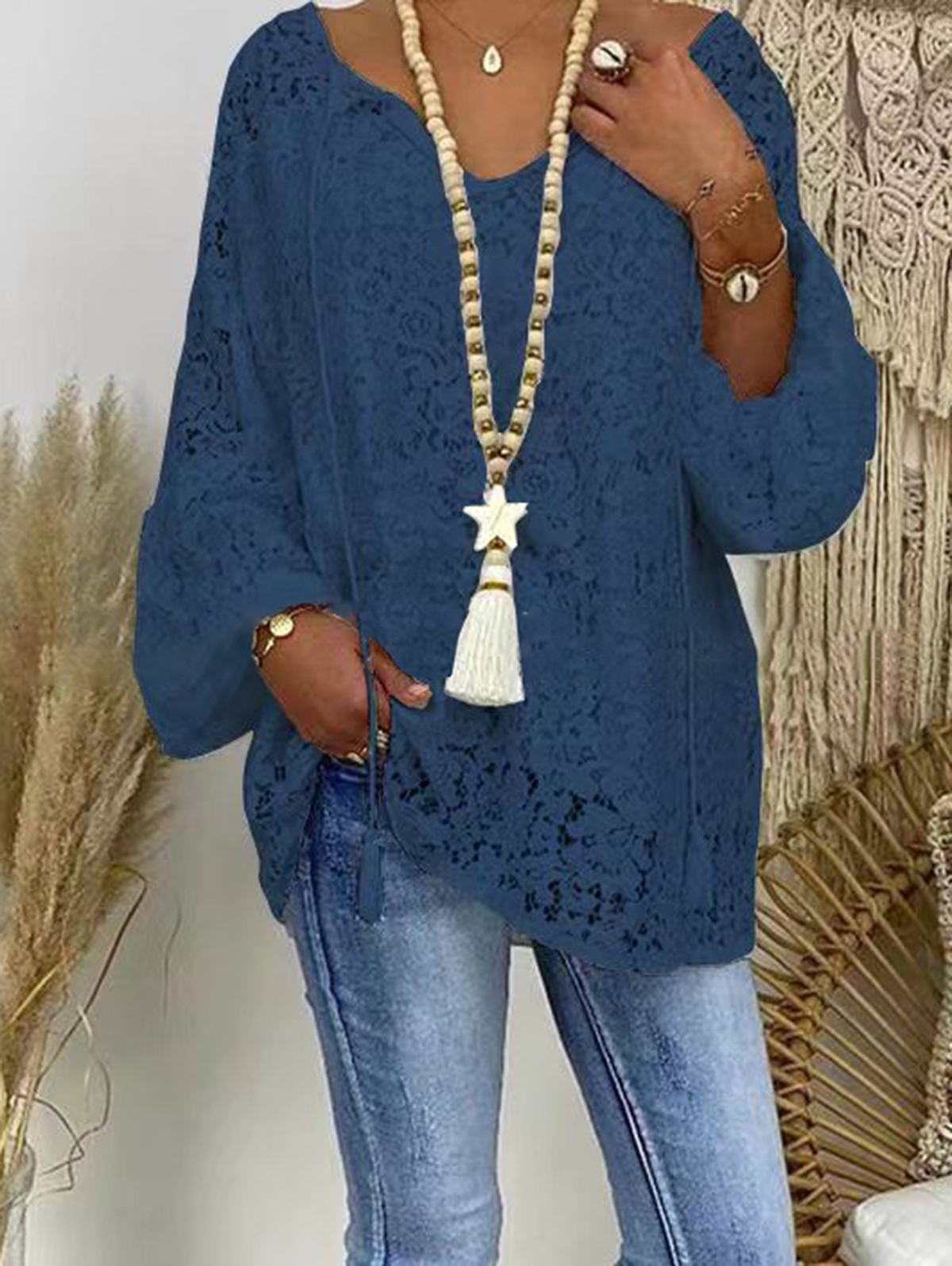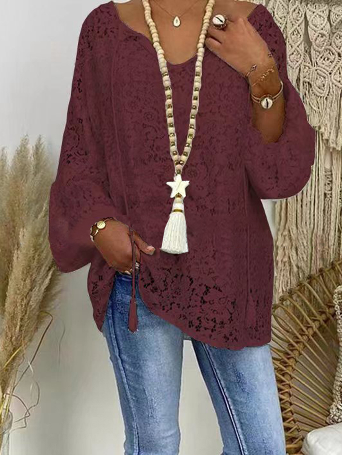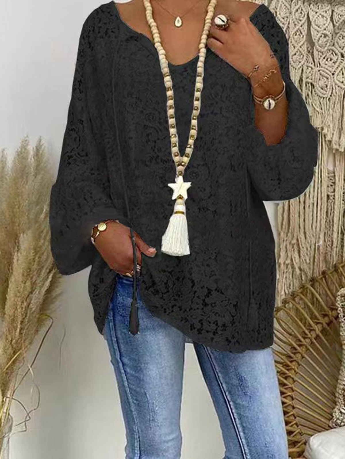 Casual V Neck Loose Lace Hollowed Drawstring Blouse