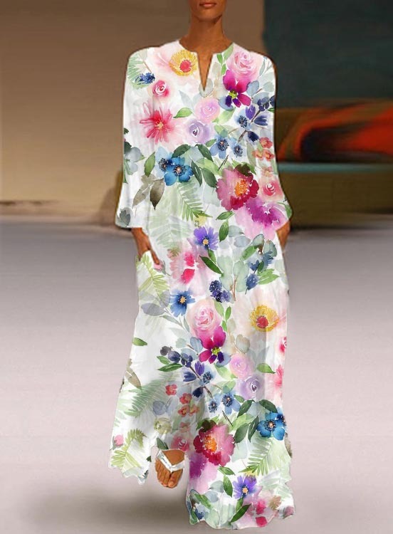 Casual Watercolor Floral V Neck Long Sleeve Dress