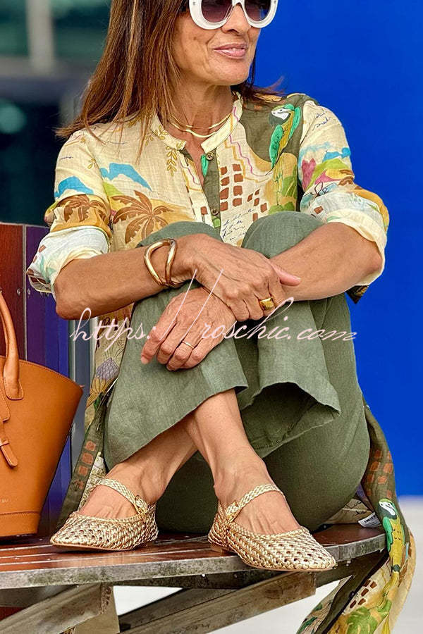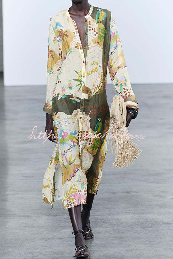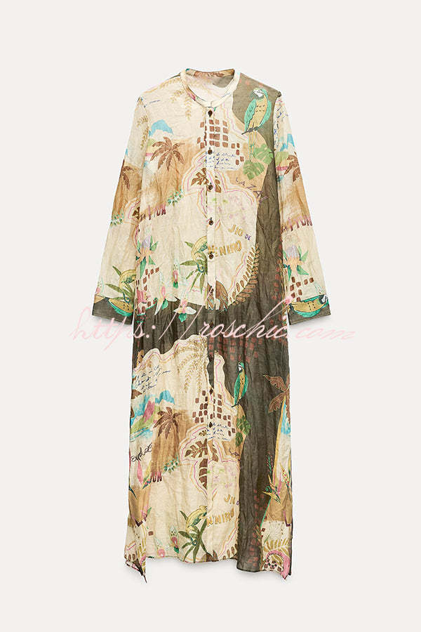 Cayla Linen Blend Unique Print Button Long Sleeve Shirt Midi Dress