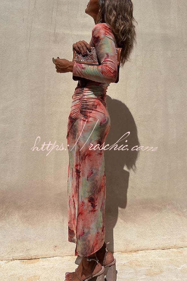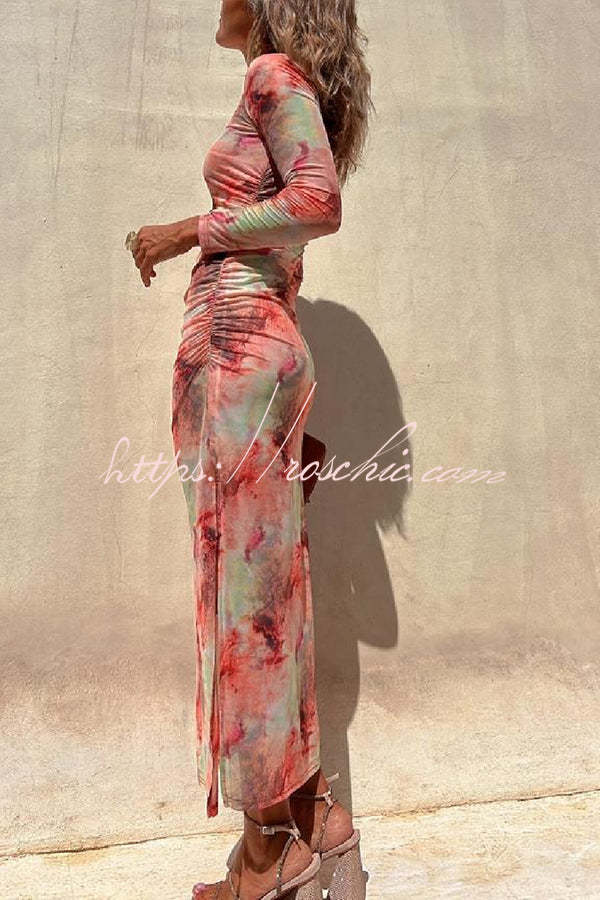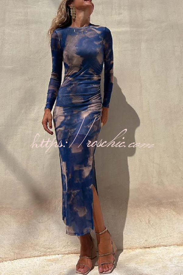 Charm Lady Mesh Overlay Tie Dye Print Long Sleeve Ruched Stretch Midi Dress