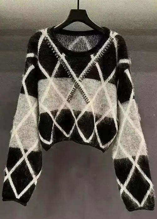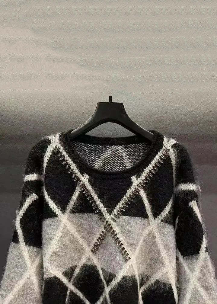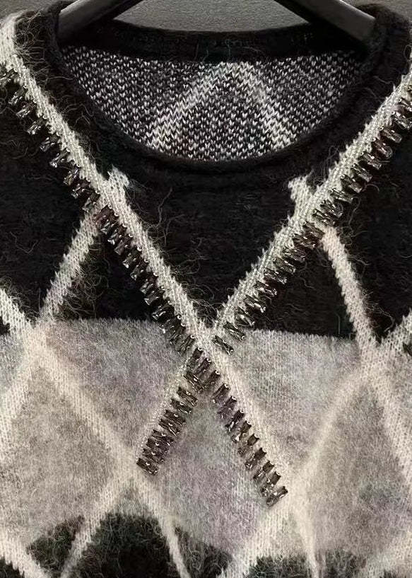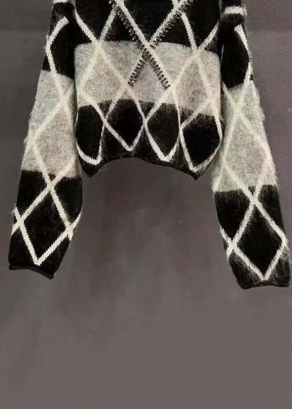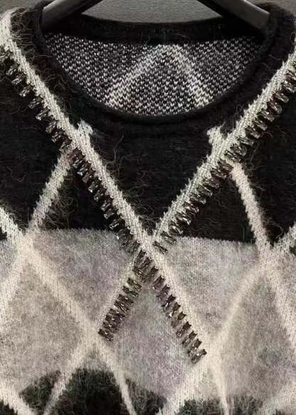 Chic Black Plaid Sequined Patchwork Cotton Knit Sweaters Long Sleeve