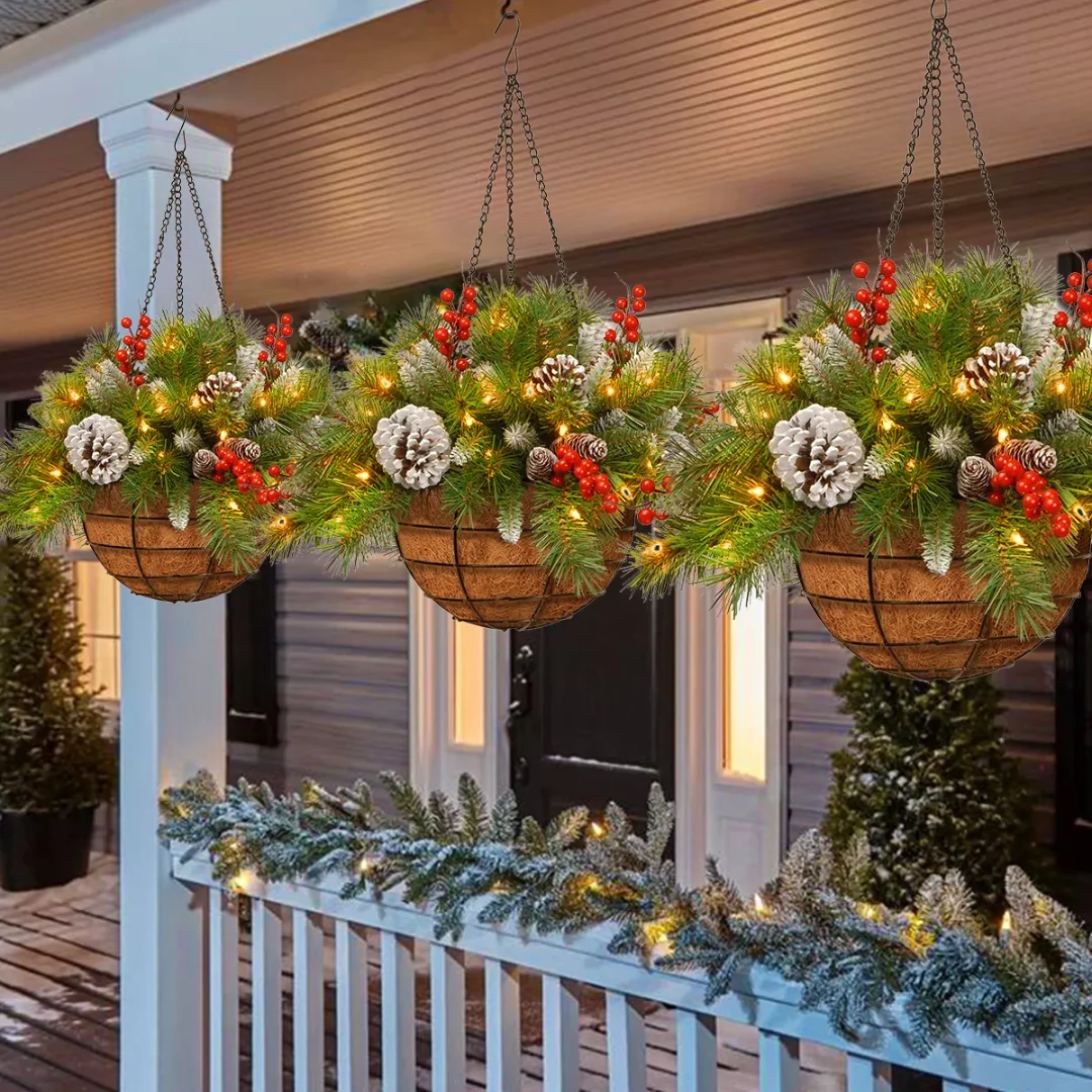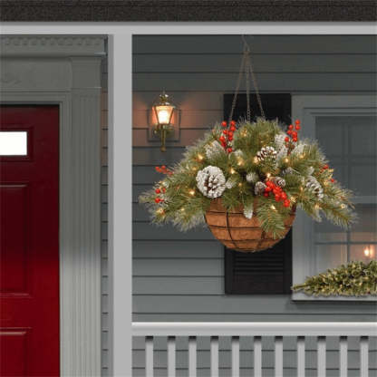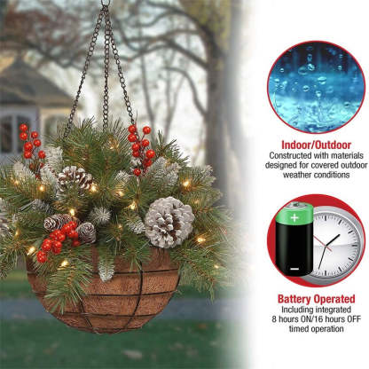 This Christmas basket features red berries, pine cones, snow and adorned with pre-strung 50 warm white LED lights. Display the colorful decoration over doors, windows, as a front door and porch basket or in any indoor and covered outdoor locations. A great choice as a housewarming gift for friends and family on Christmas, fall, winter, and festivals.