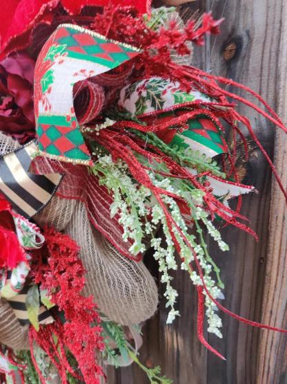 It has an elegant and sophisticated Victorian/Old World style but will lend itself to any décor. I have decorated it with sequined red to burgundy poinsettias, glittered decorative grapevine orbs, velvet holly with glittered berries, large and small berry branches, and pinecones.