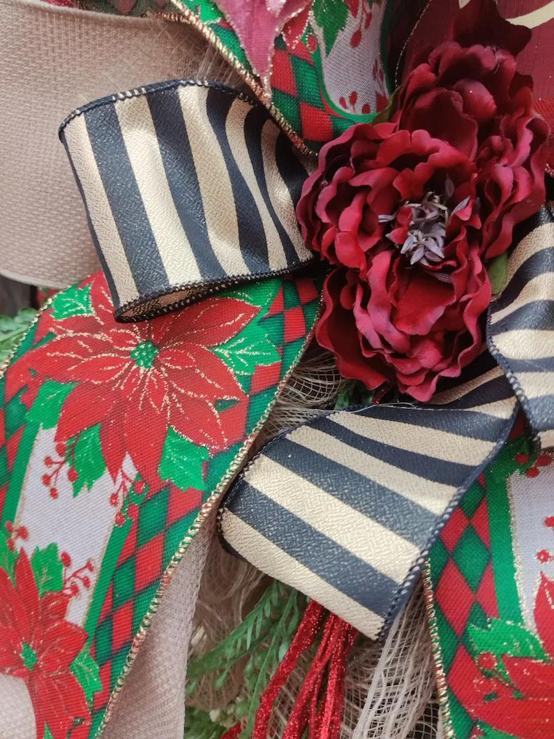 I began this arrangement on a thick and lush evergreen wreath base (faux of course). I hand tied a stunning double bow with a 4” wide high end elaborate designer ribbon that is just to drool over.