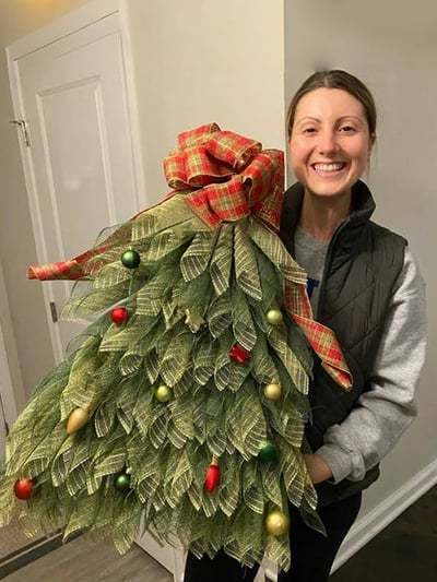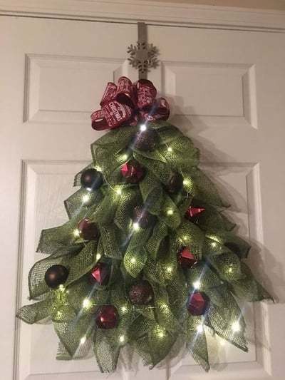 🎄The Christmas tree body is made of green polyester burlap netting. The bow topper is red, and green polyester burlap netting. (Red, Green, Gold)Berry accents and a cute bow with the Christmas tree decoration complete the look.