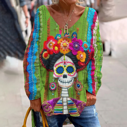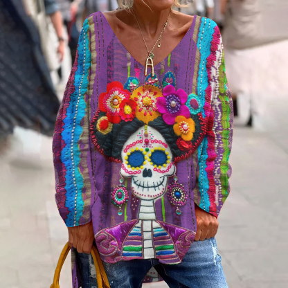 Classy Mexican Sugar Skeleton Catrina Day Of The Dead Inspired Pattern Art Printed V-Neck T-Shirt