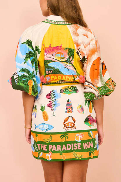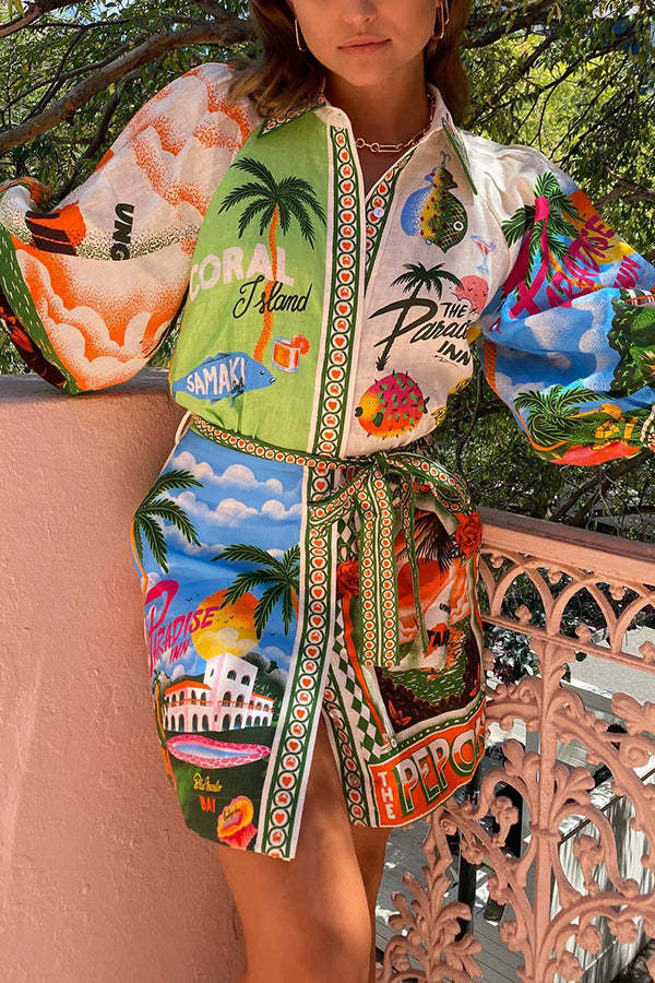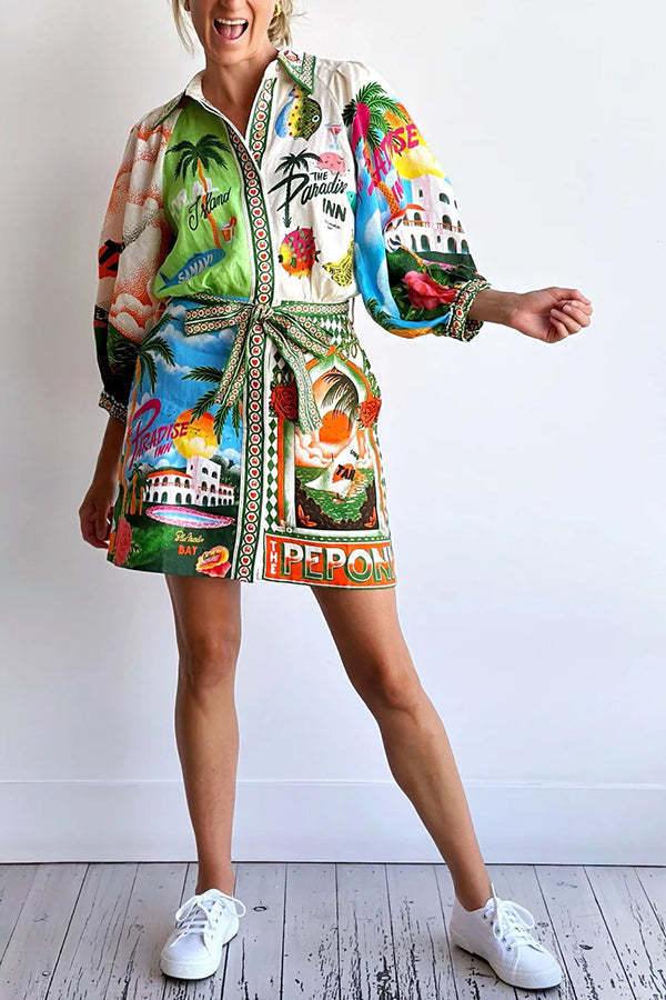 Summer Sophistication Linen Blend Unique Print Belted Pocket Shirt Mini Dress