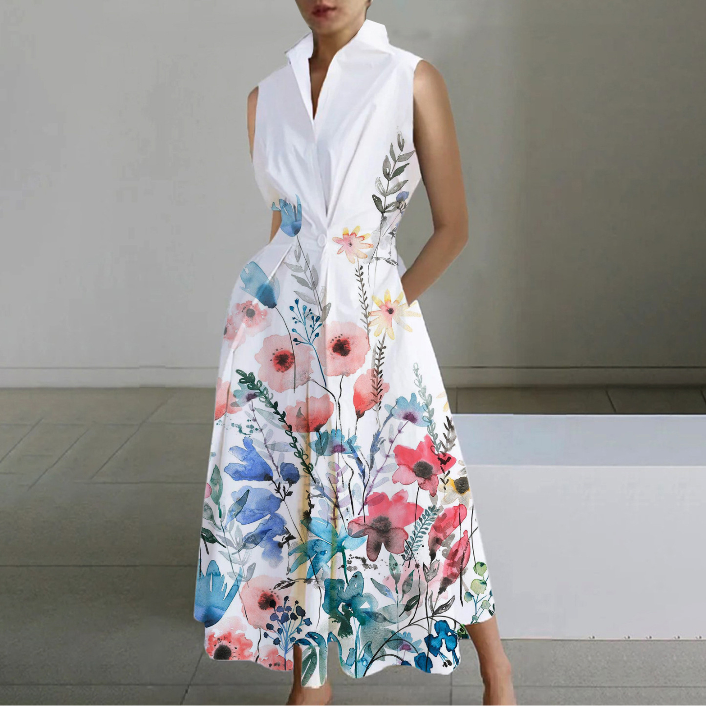 Commuter Fashion Floral V-Neck Sleeveless Dress