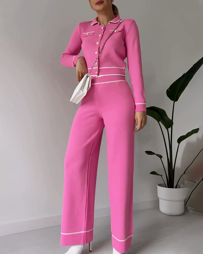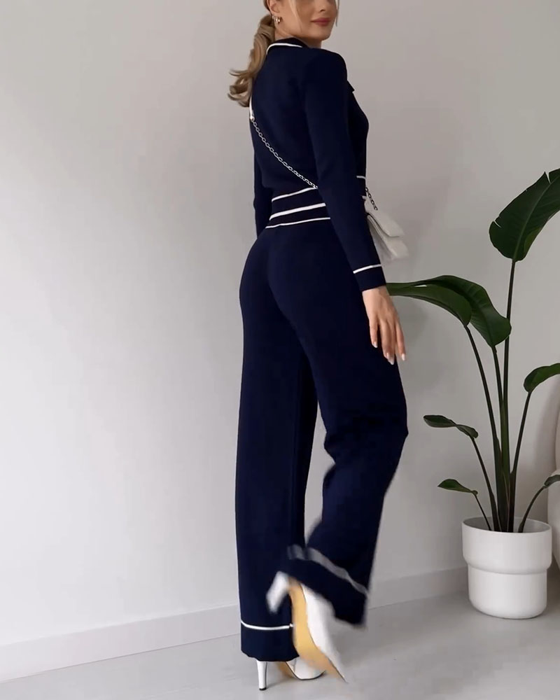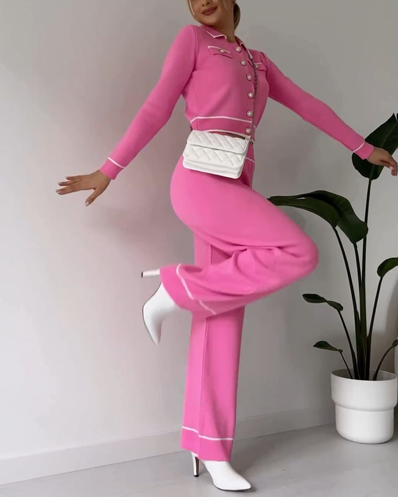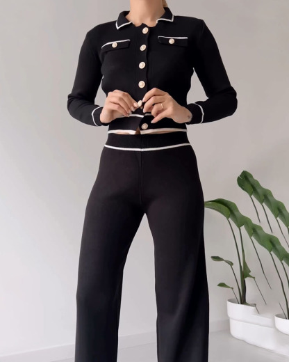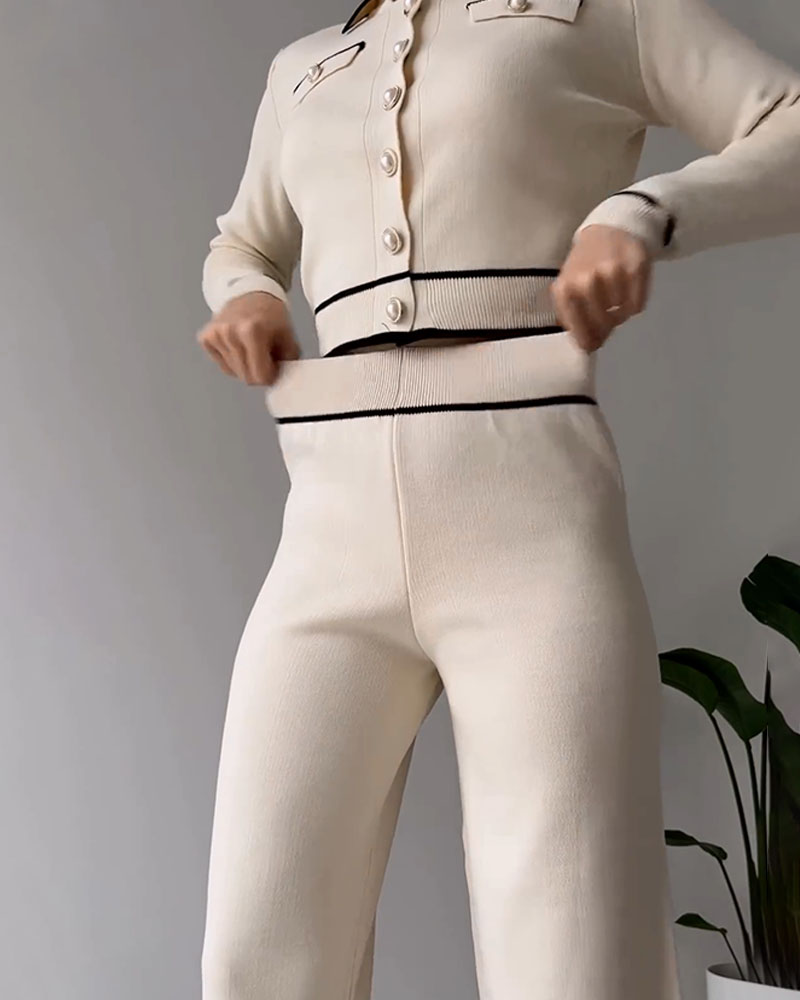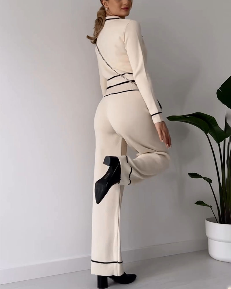 Contrast color patchwork knitted casual two-piece set