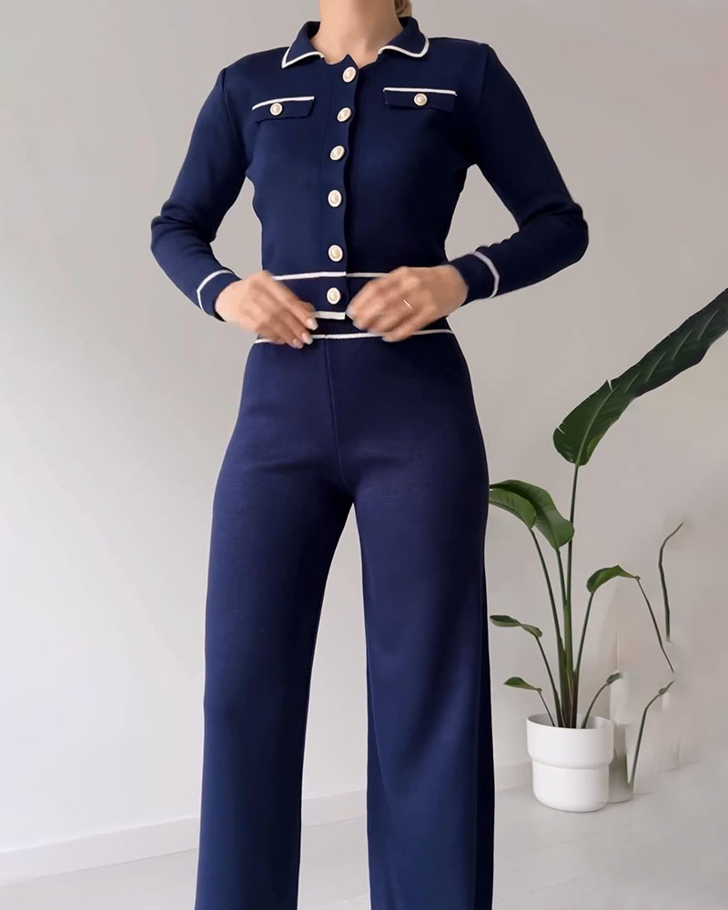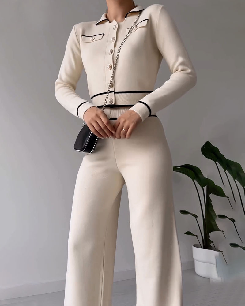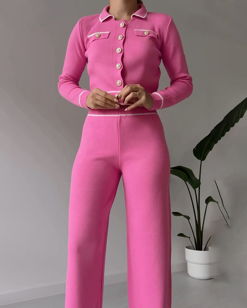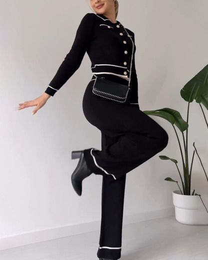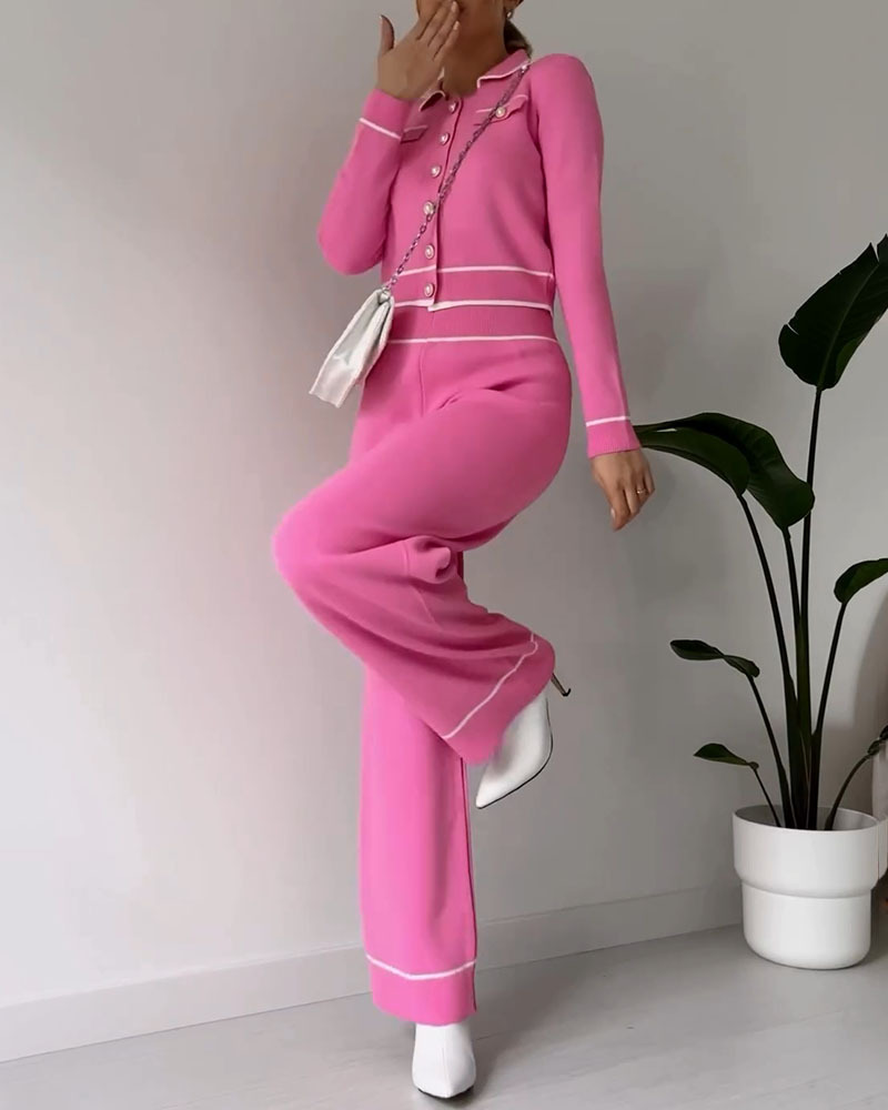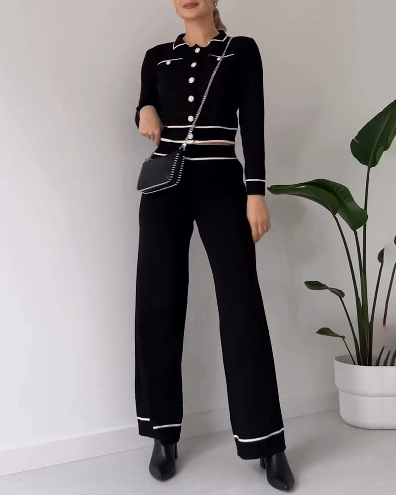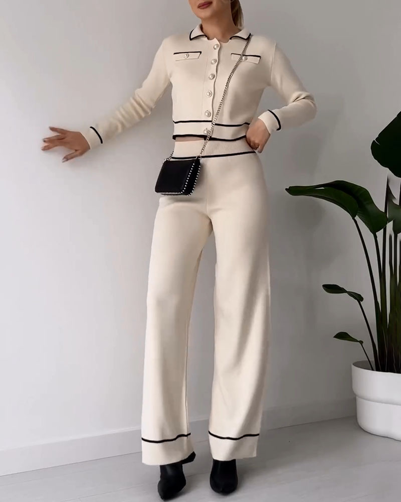 Contrast color patchwork knitted casual two-piece set