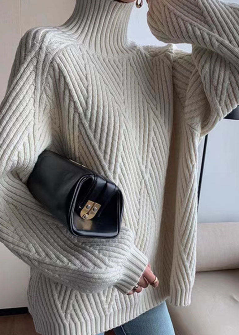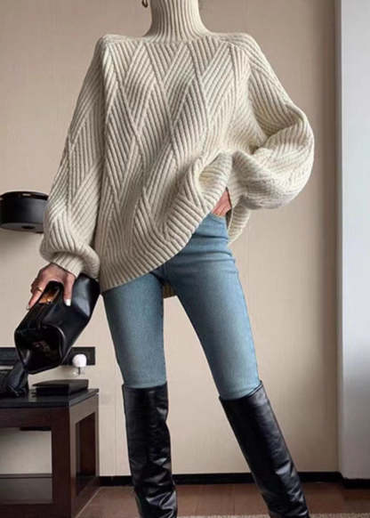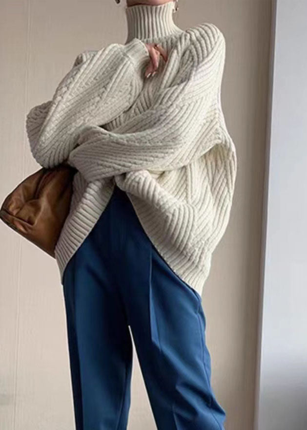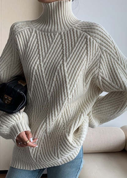 Cozy Beige Hign Neck Thick Patchwork Knit Sweaters Long Sleeve