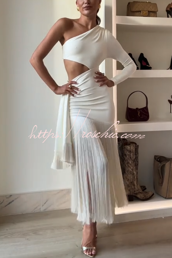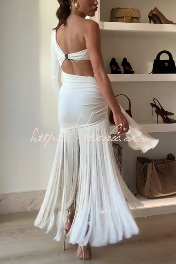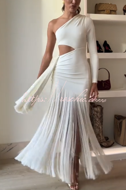 Amazing Type One Shoulder Cutout Drape Tassle Trim Stretch Maxi Dress