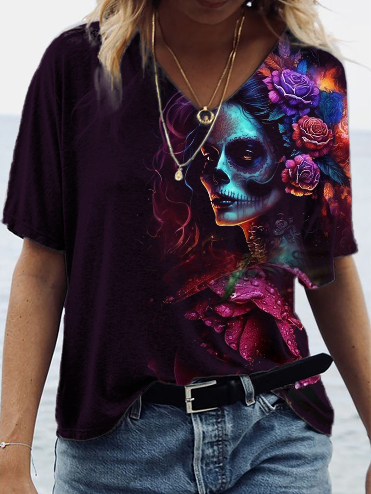 Day of the Dead Floral Art V Neck T Shirt