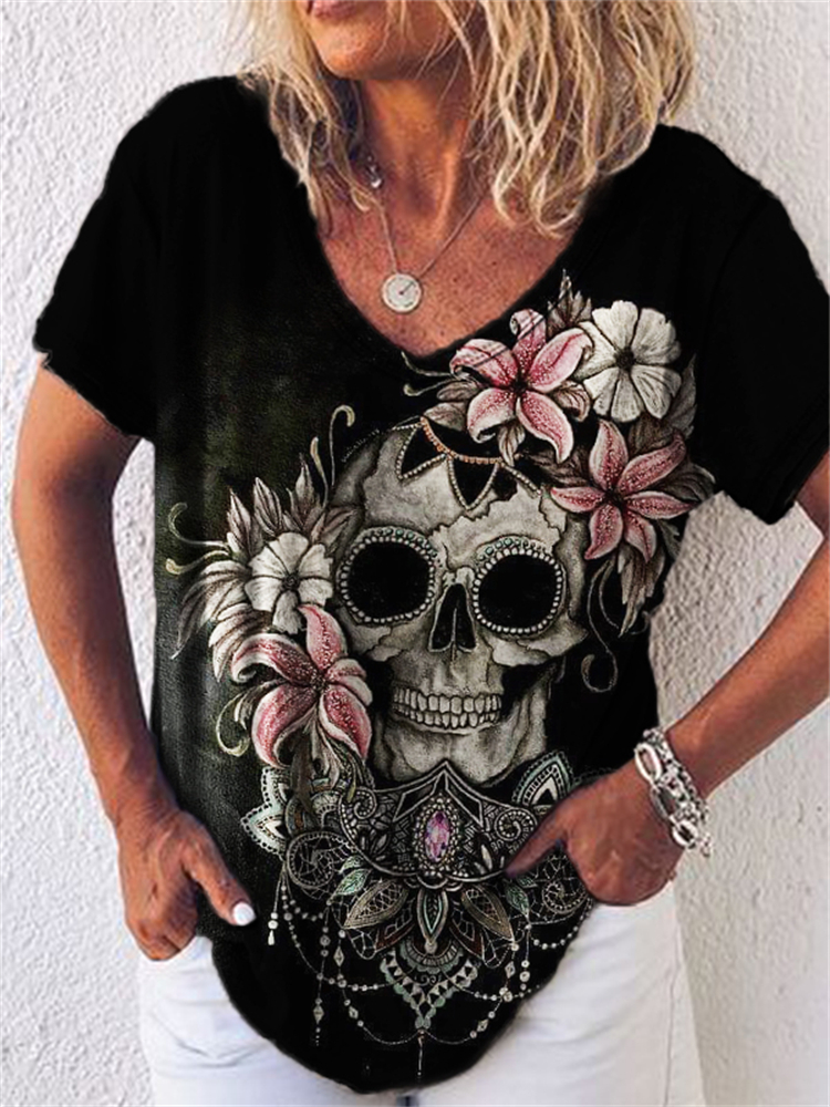 Day Of The Dead Flower Skull Print V Neck T Shirt